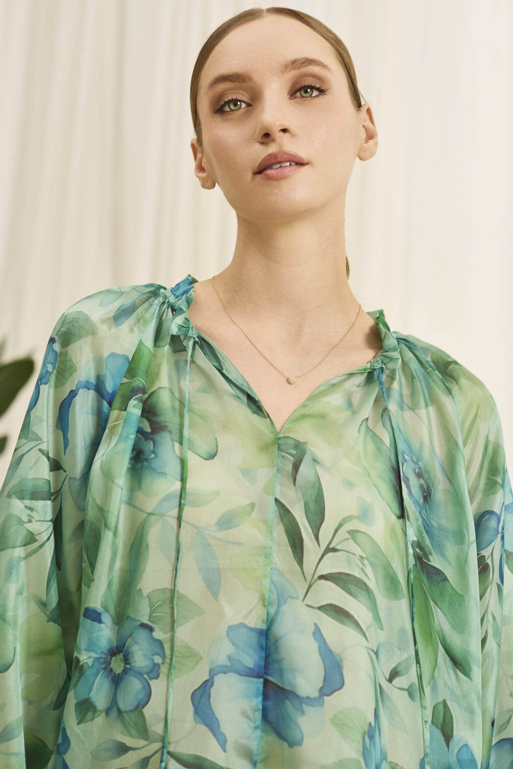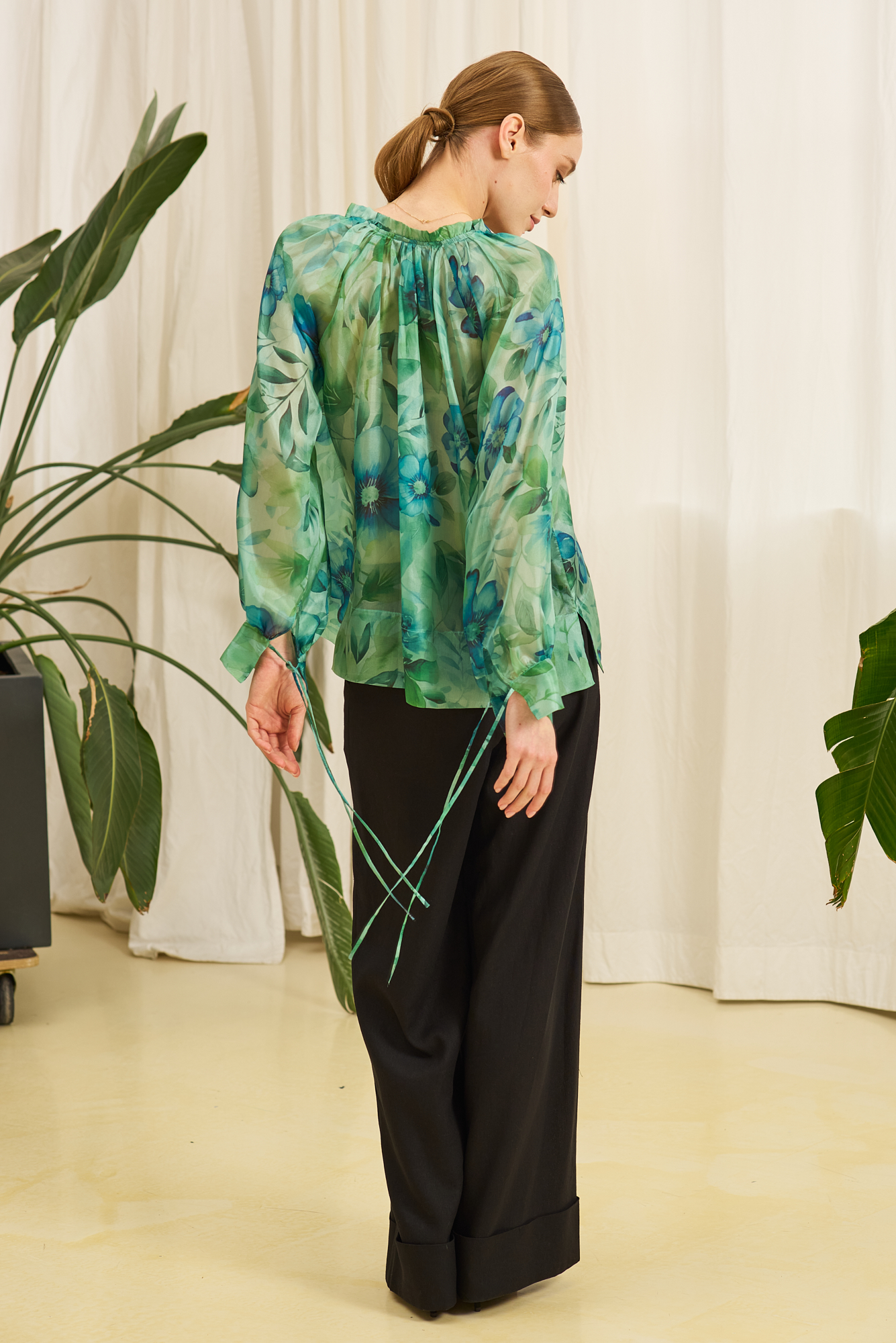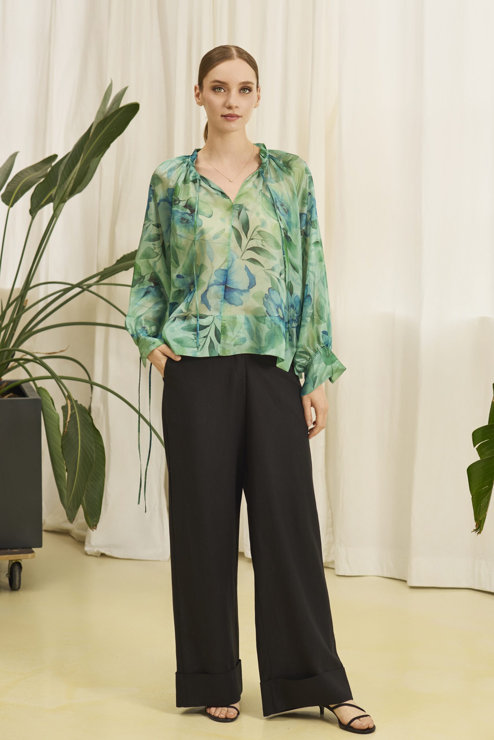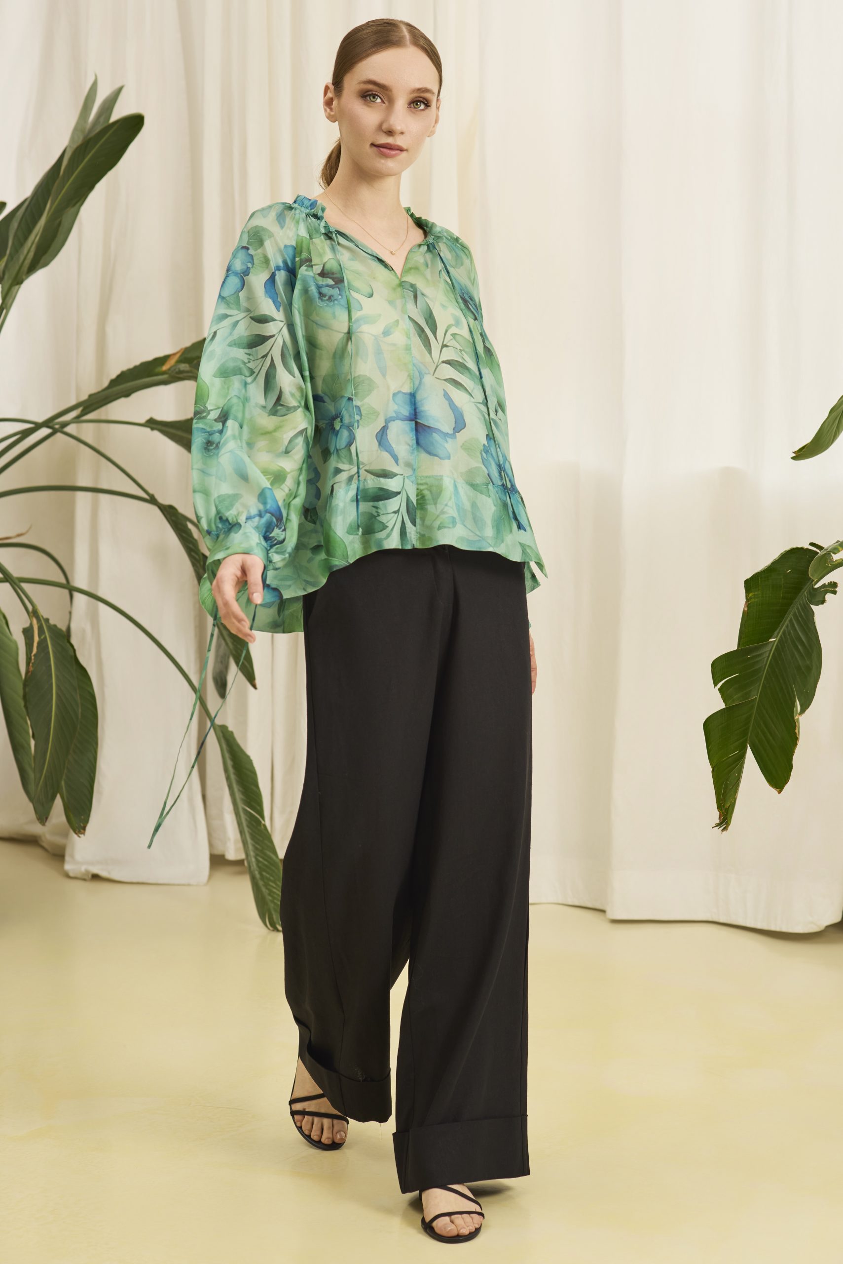 O piesă versatilă și rafinată, această bluză din matase imprimata îmbină naturalețea materialului cu o croială feminină și fluidă. Textura ușor transparentă oferă un plus de delicatețe, iar mânecile lungi, ample, completează look-ul cu un aer boem și sofisticat.
