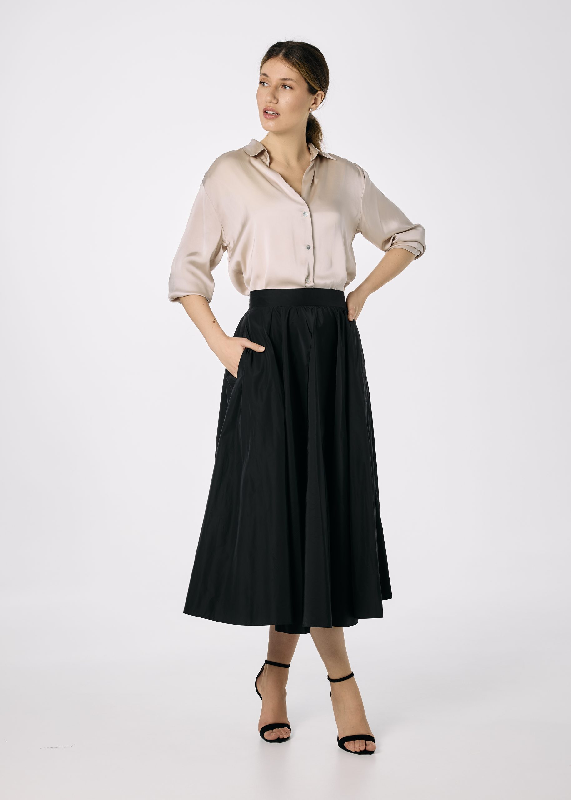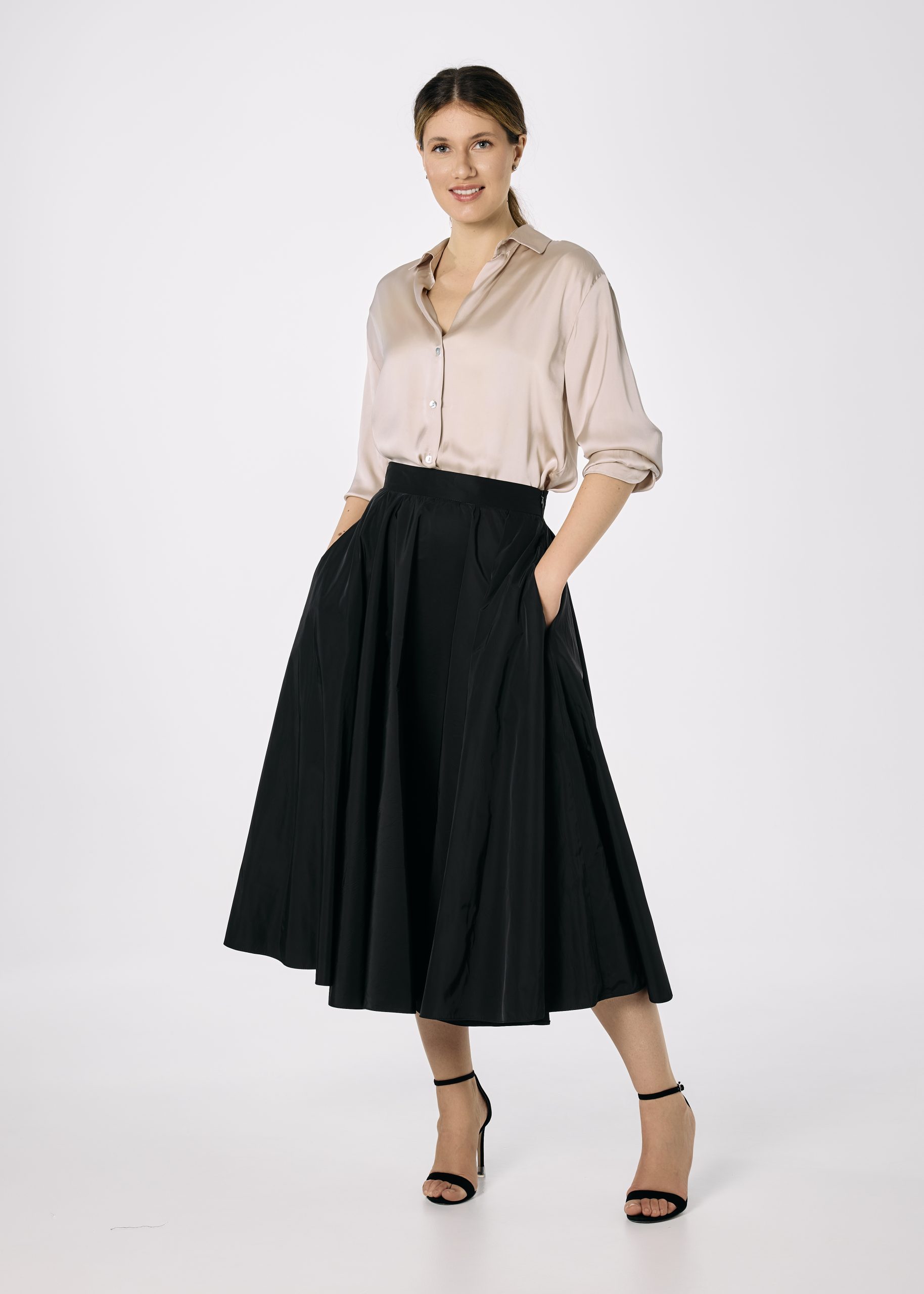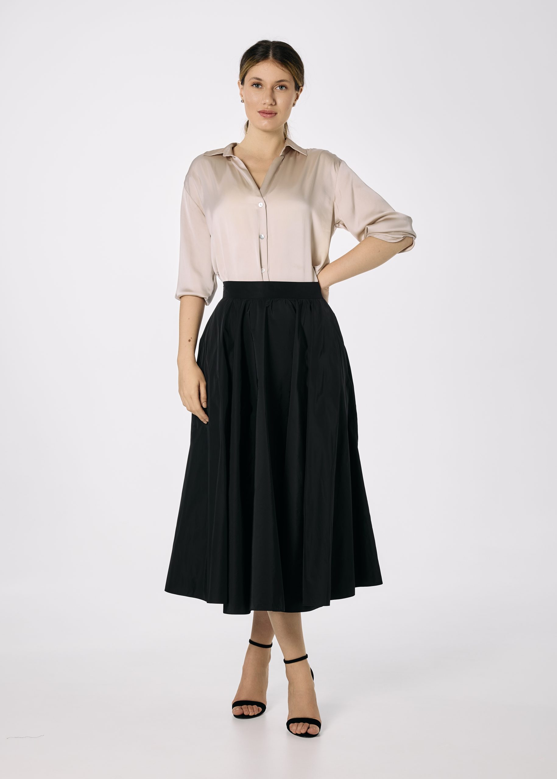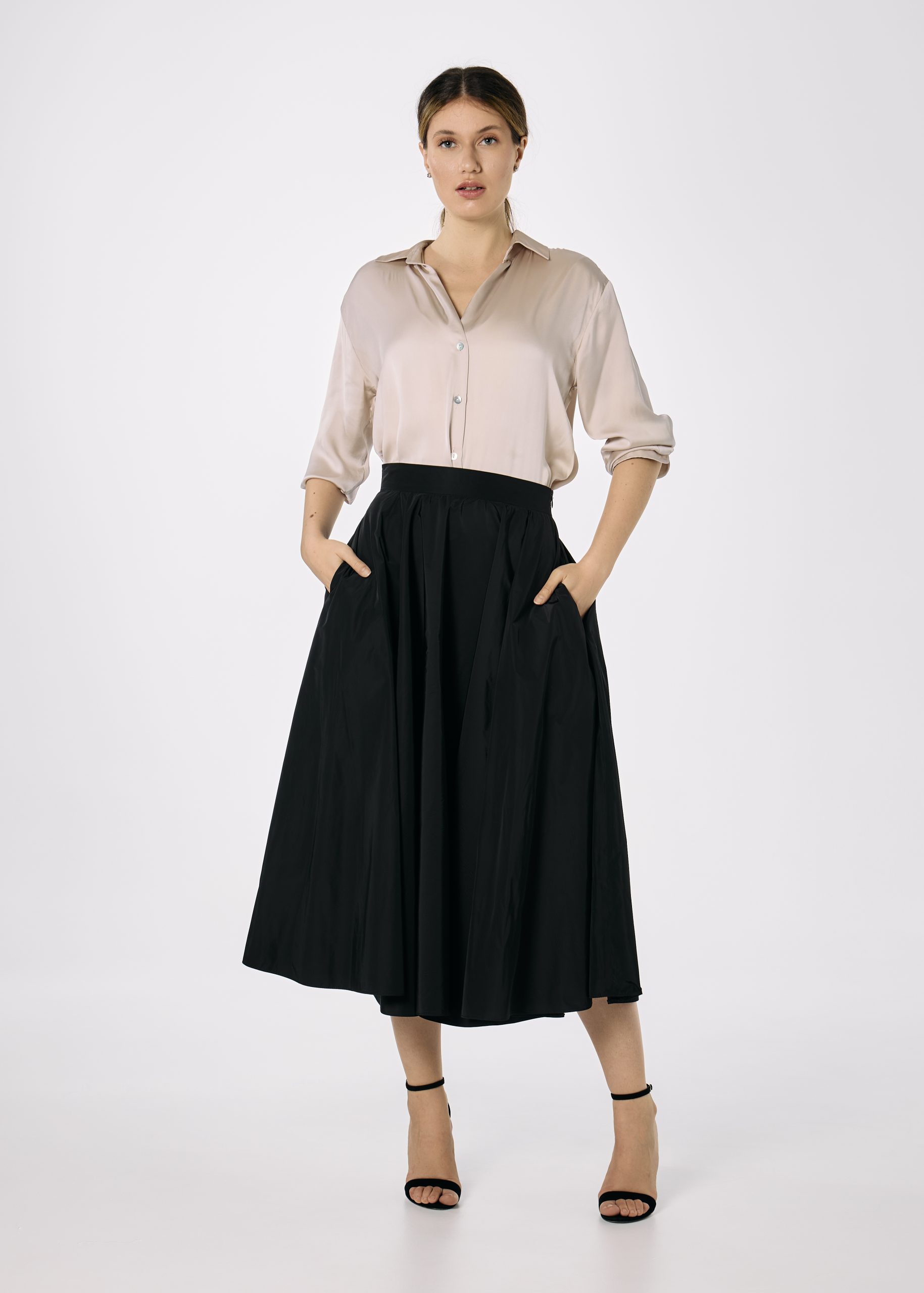 Fusta din tafta neagra croita pe closh amplu. Fusta are betelie fixa, fermoar lateral ascuns si are buzunare.