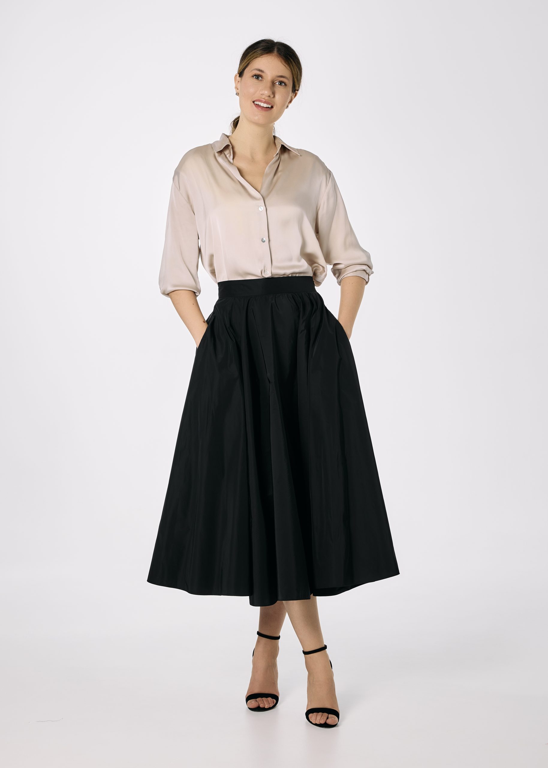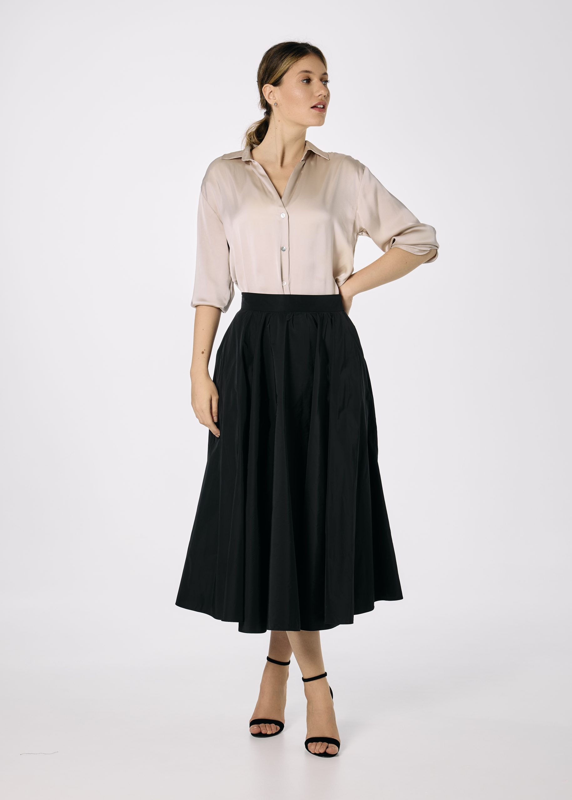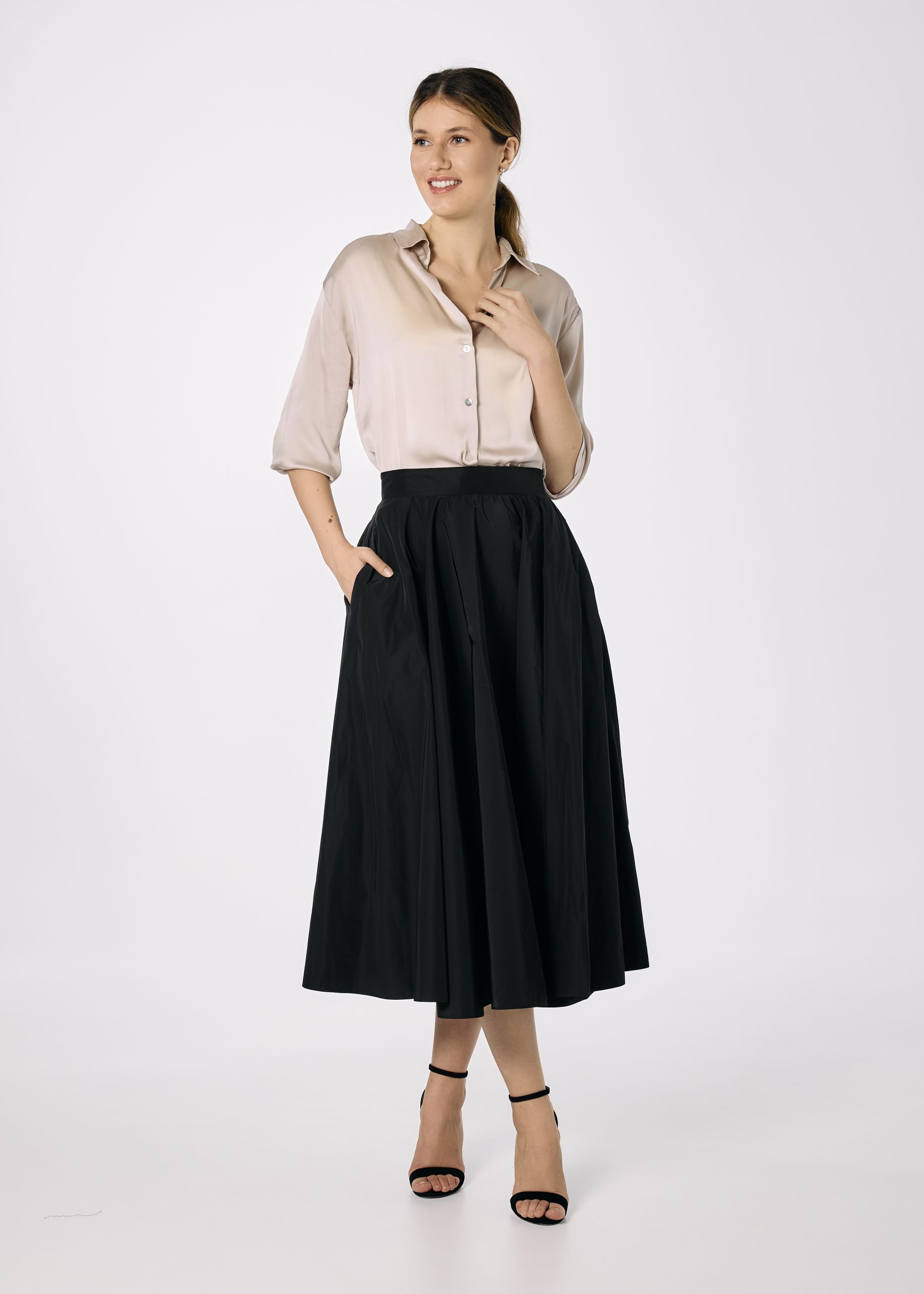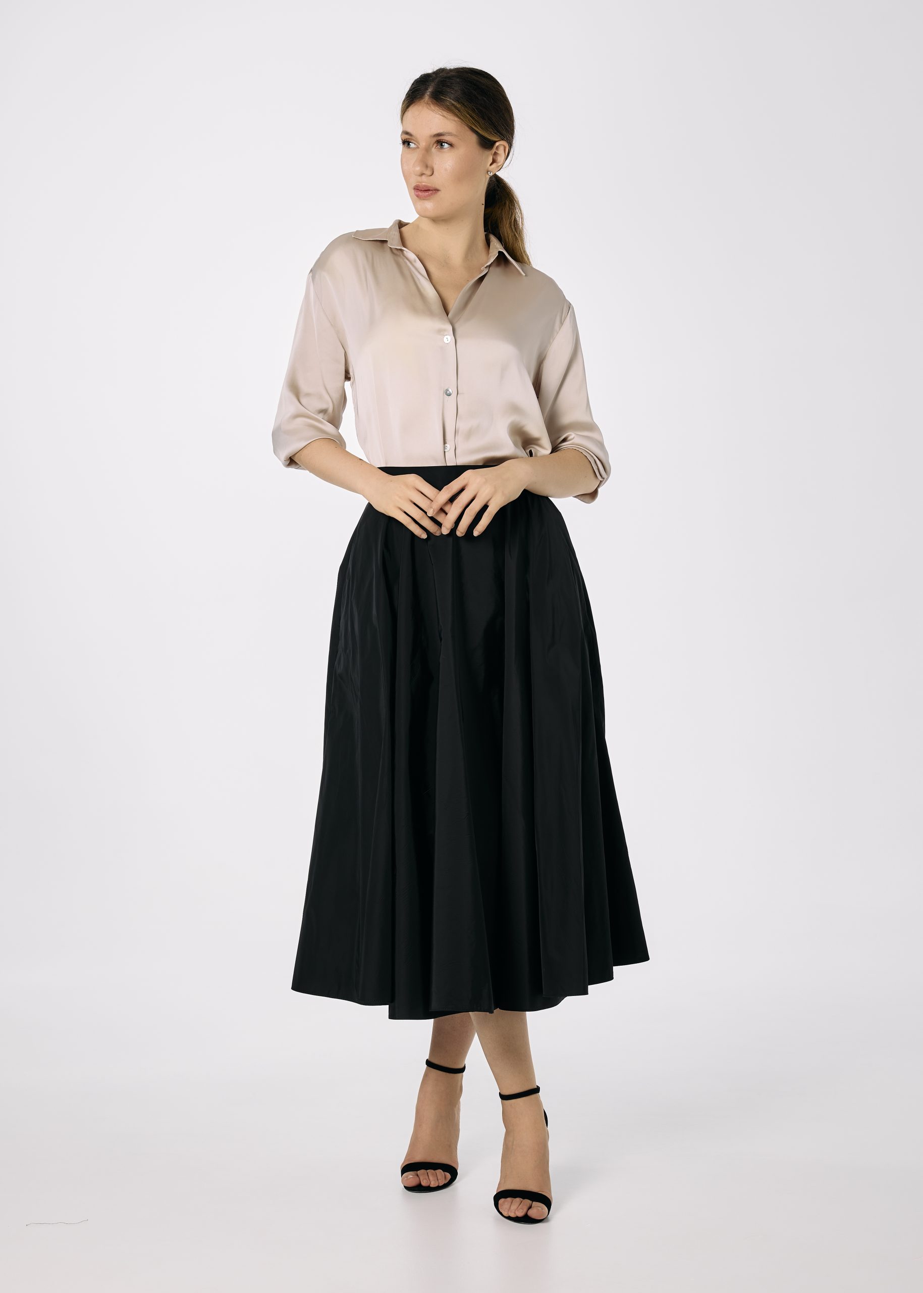 Fusta din tafta neagra croita pe closh amplu. Fusta are betelie fixa, fermoar lateral ascuns si are buzunare.