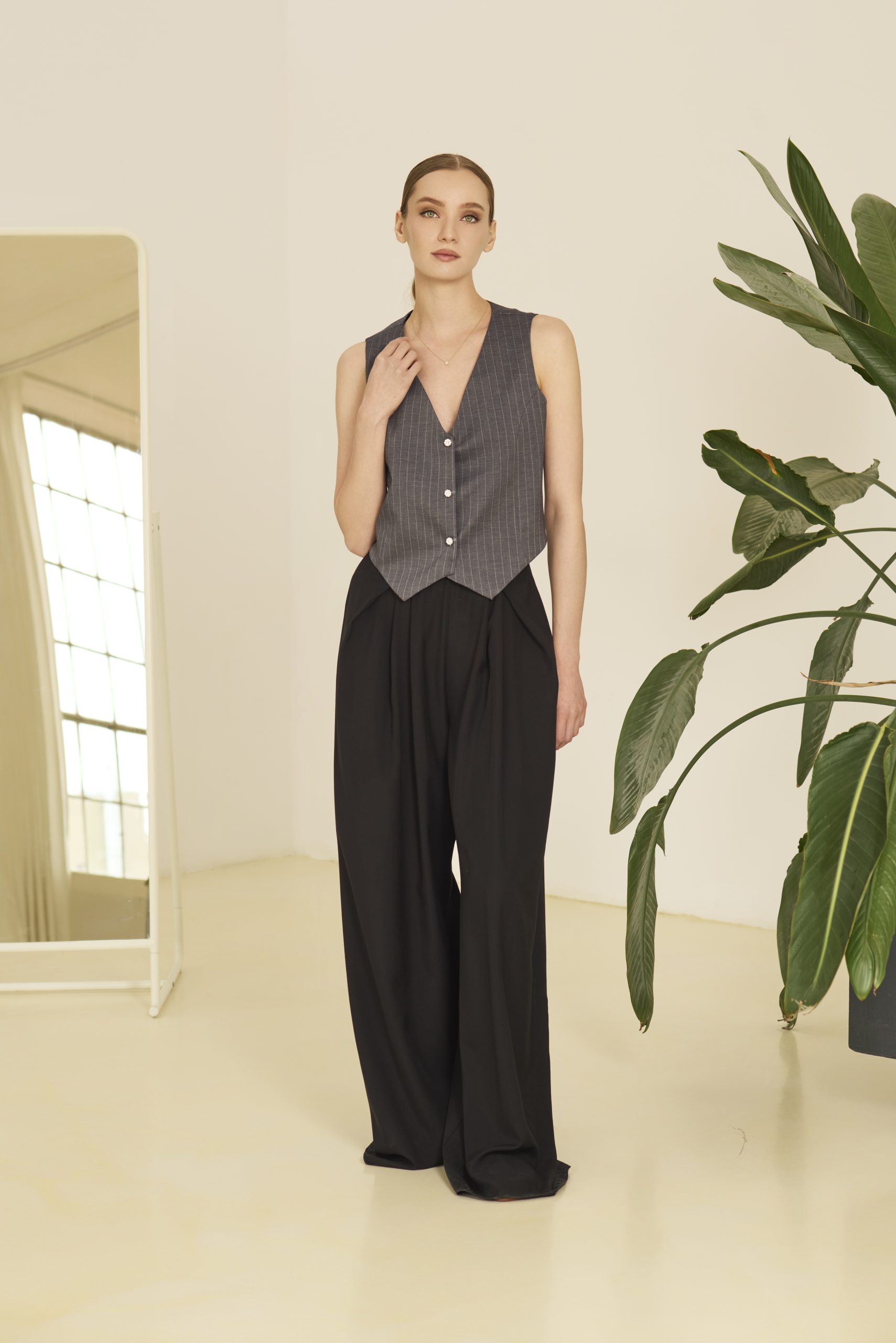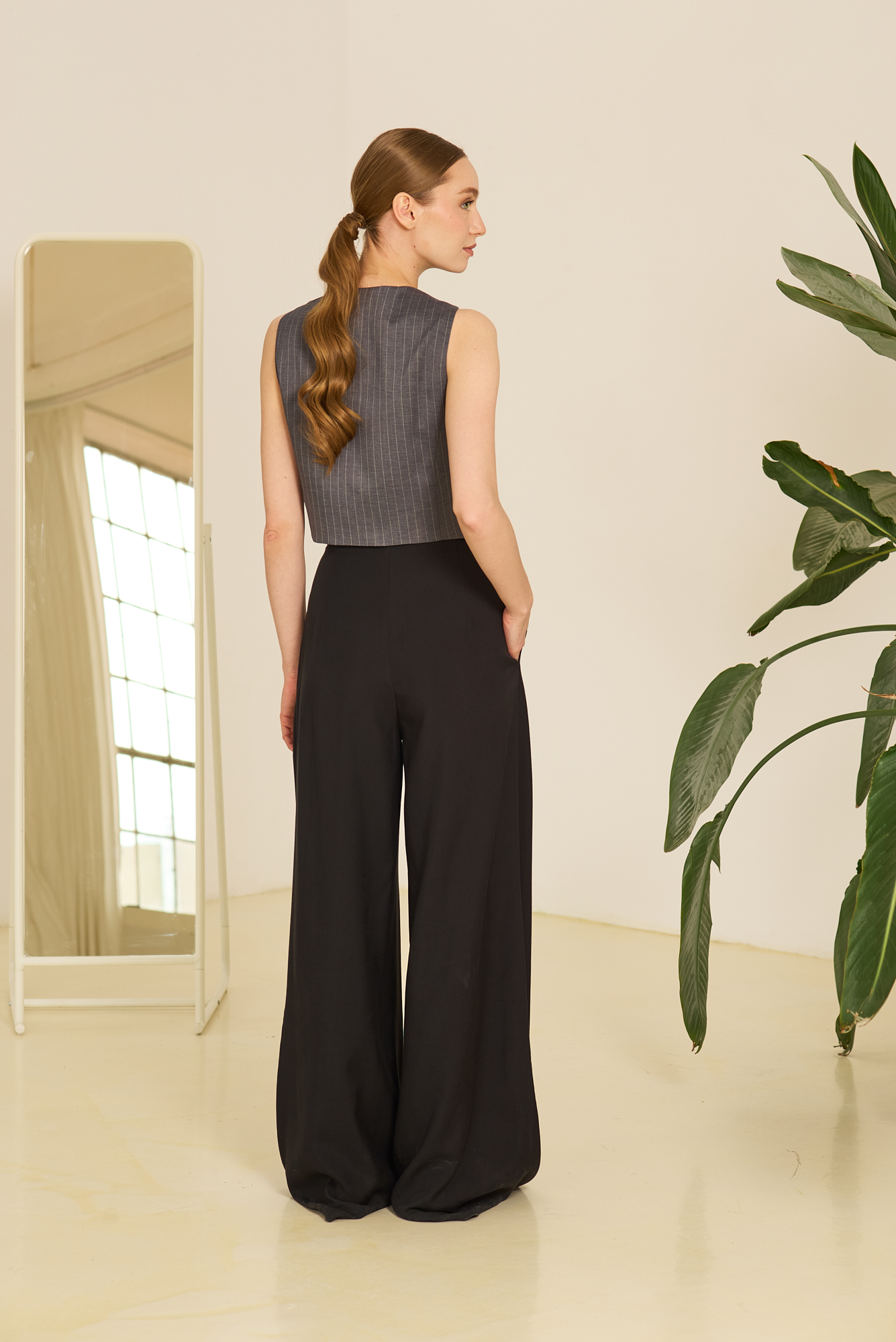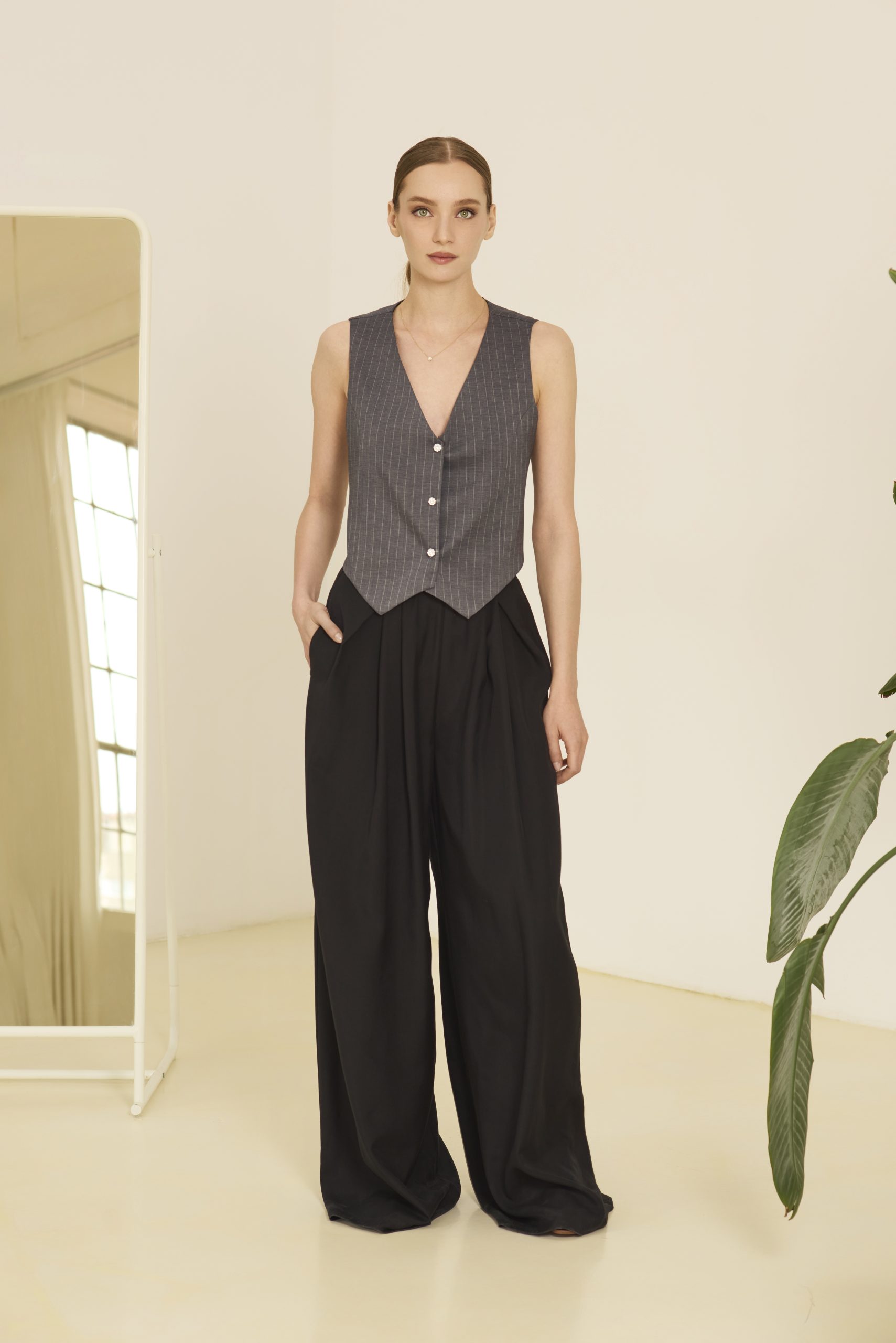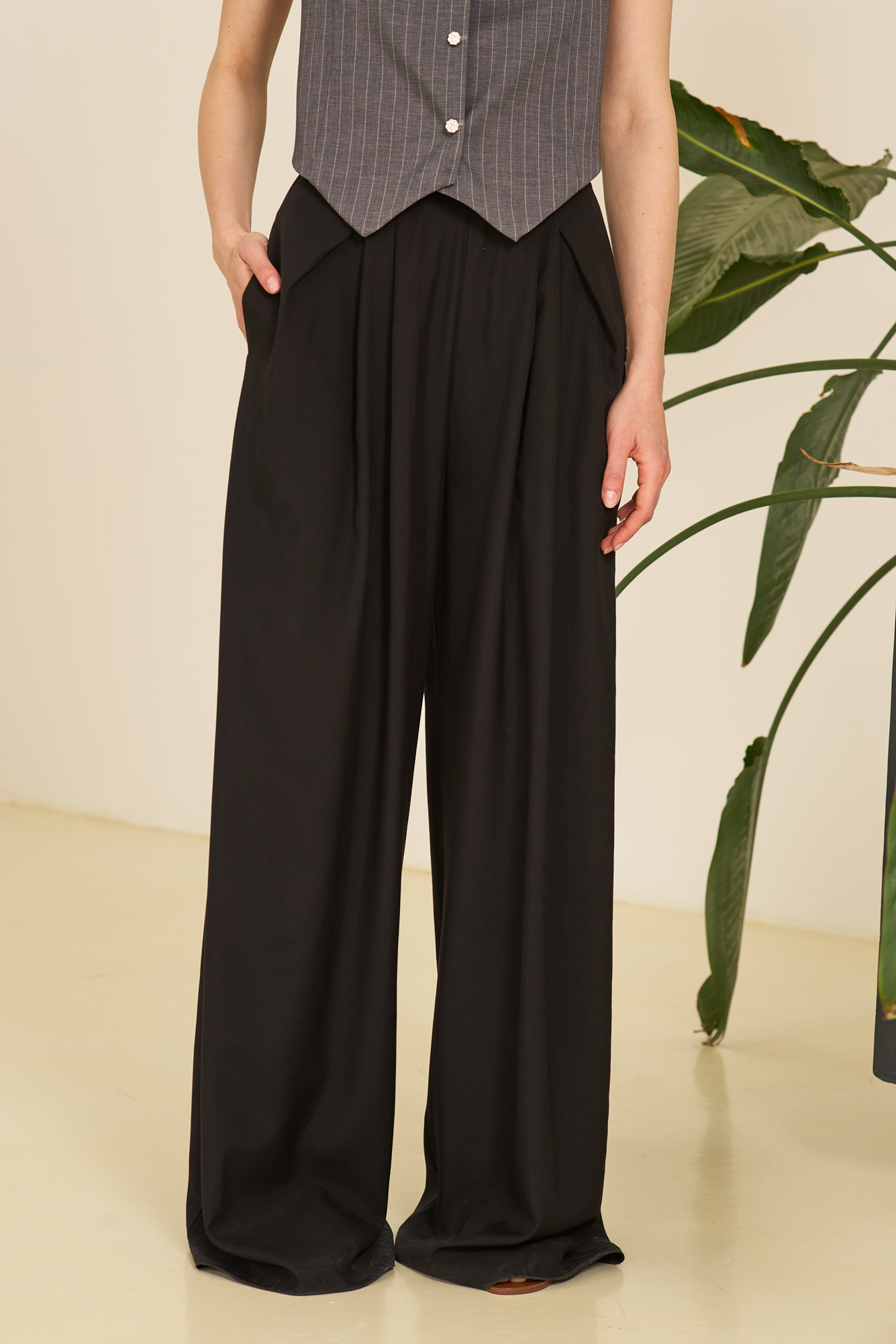 Pantaloni largi de vara. Pantalonii au buzunare laterale, betelie fixa si inchidere cu fermoar.