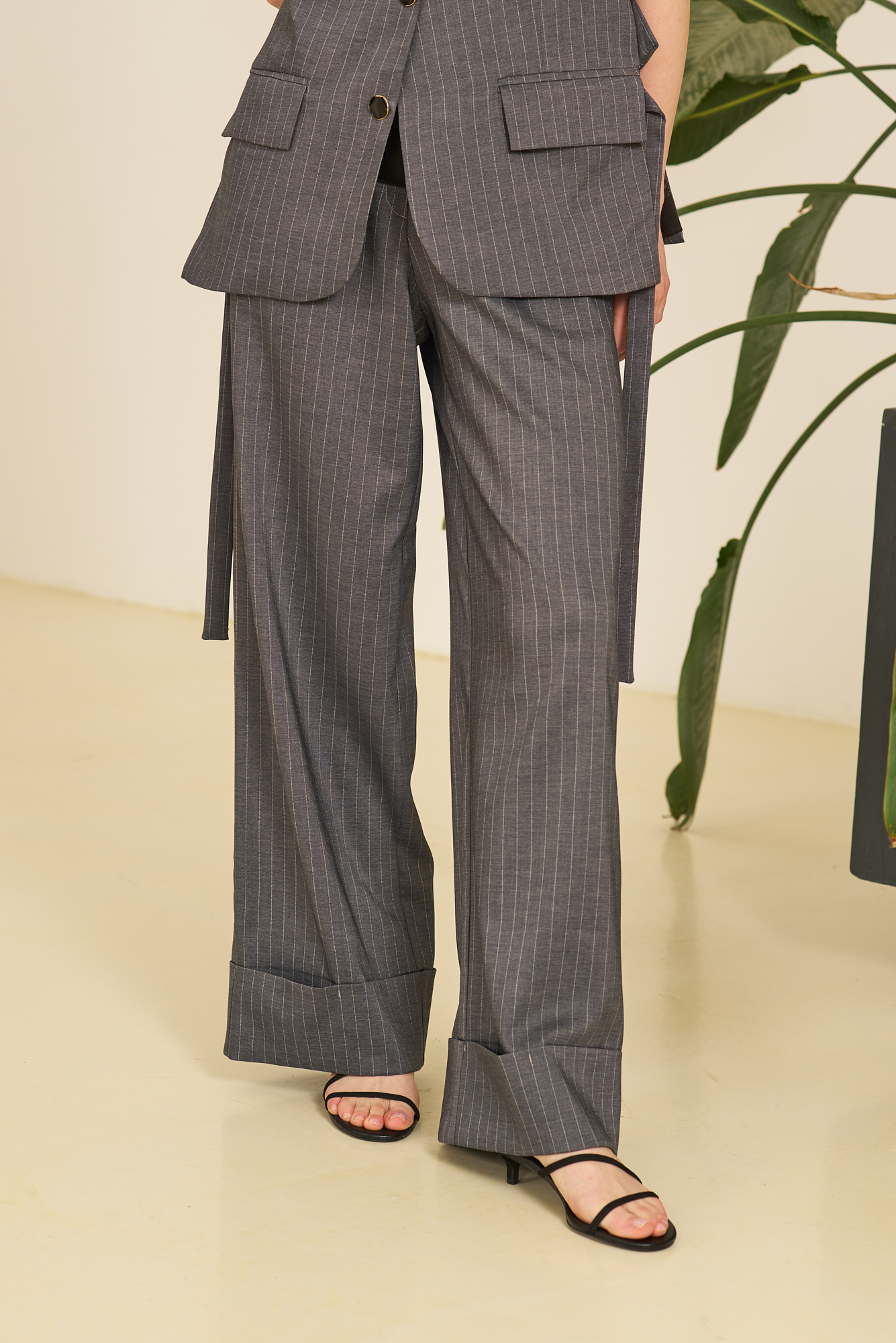 Pantaloni largi din stofa subtire gri cu dungi. Pantalonii au buzunare laterale, betelie fixa si inchidere cu fermoar.