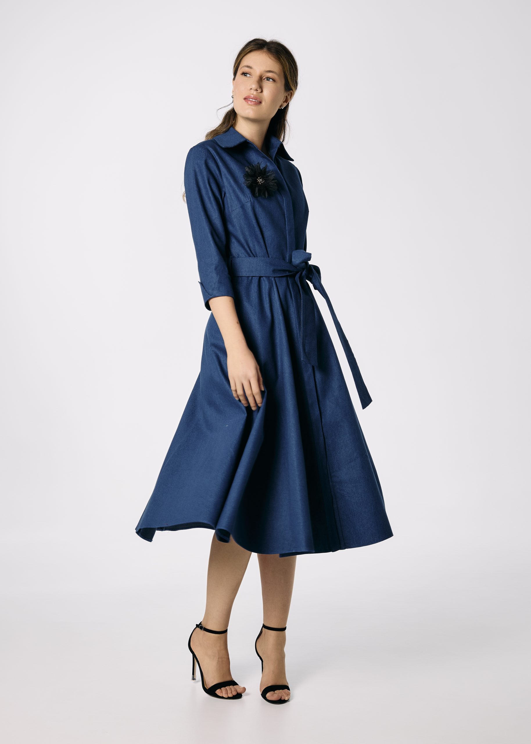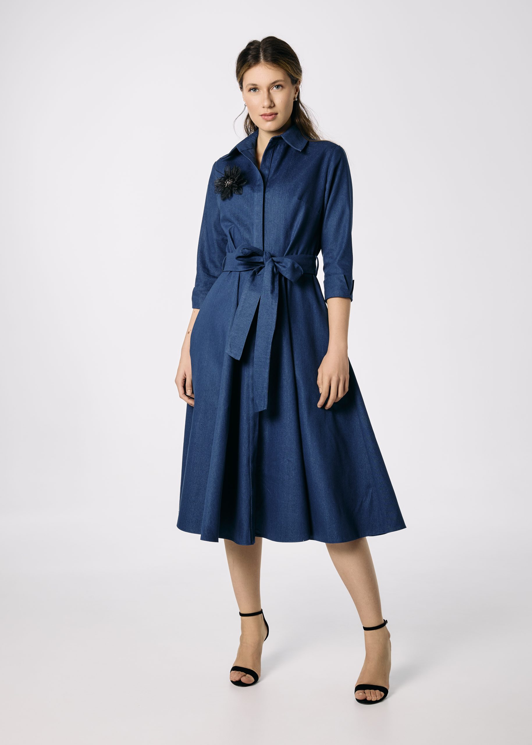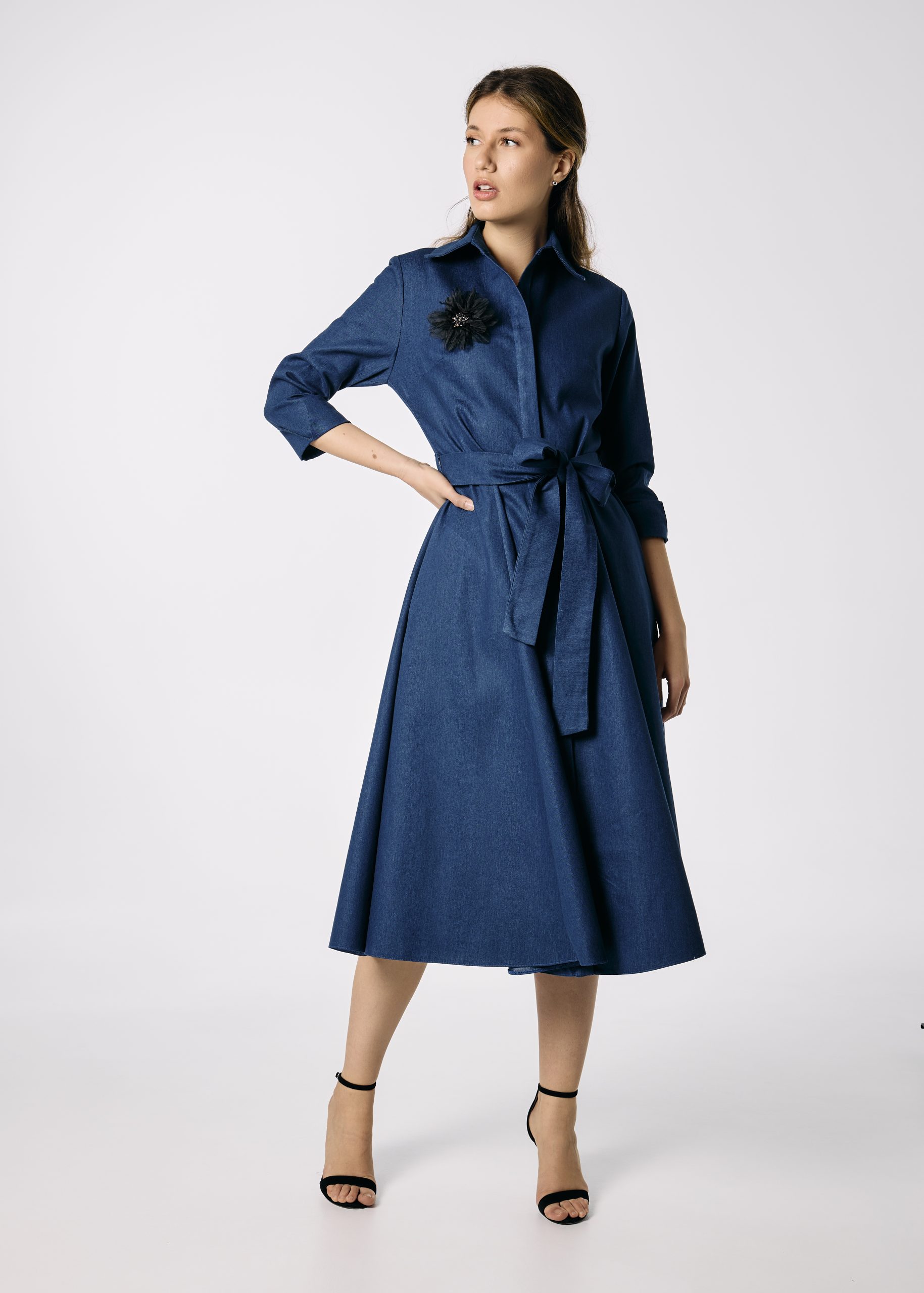 Rochie cămașă din denim în clini cu cordon și floare decorativă – Feminitate cu atitudine casual