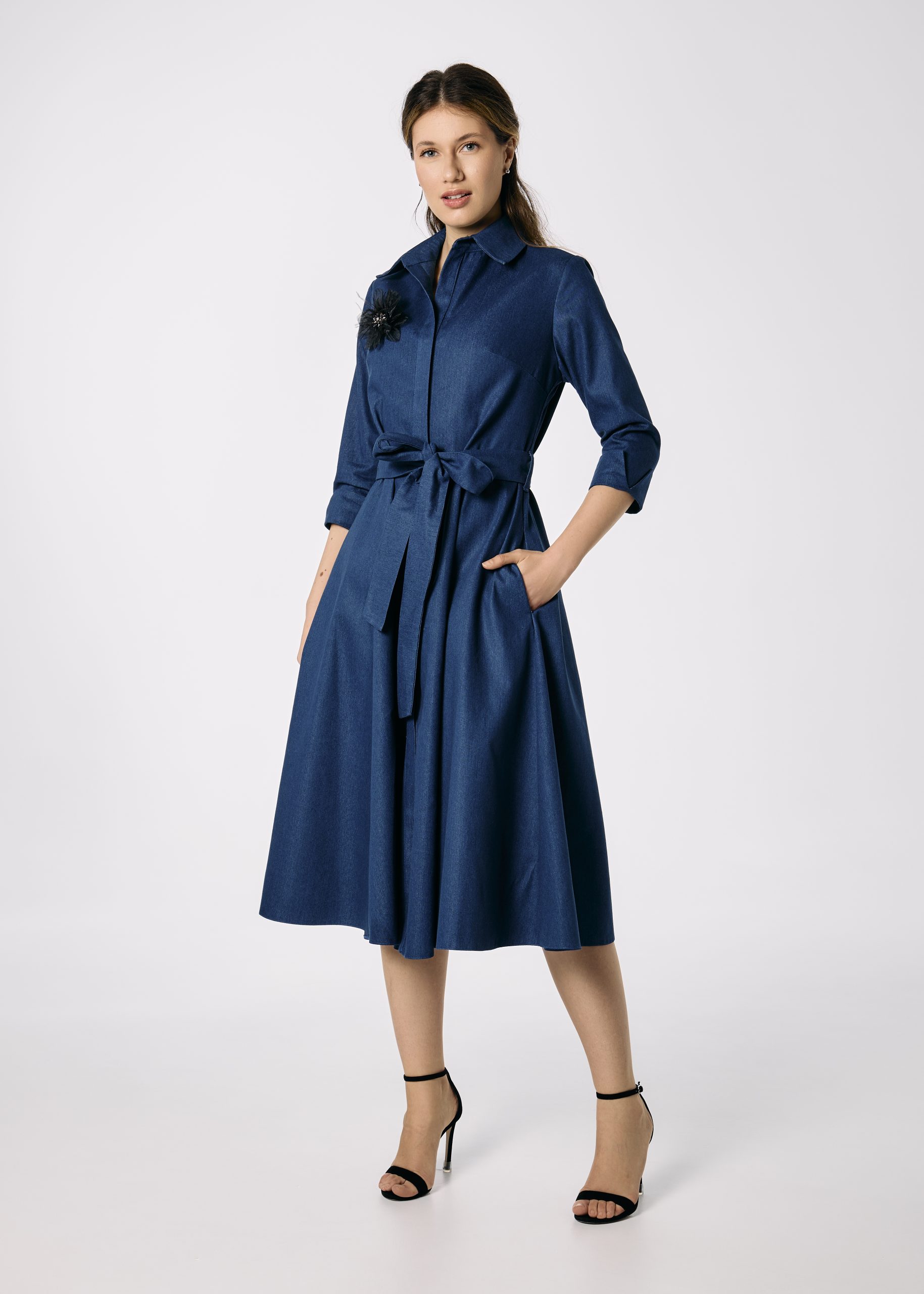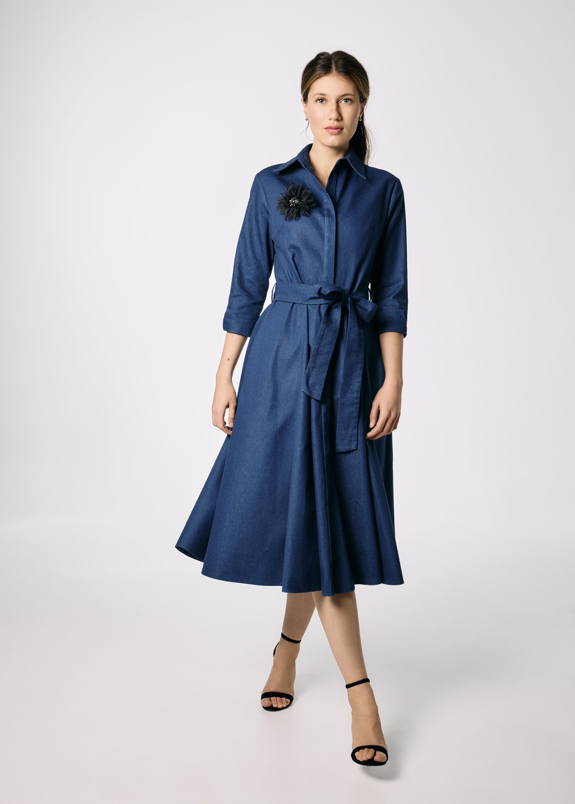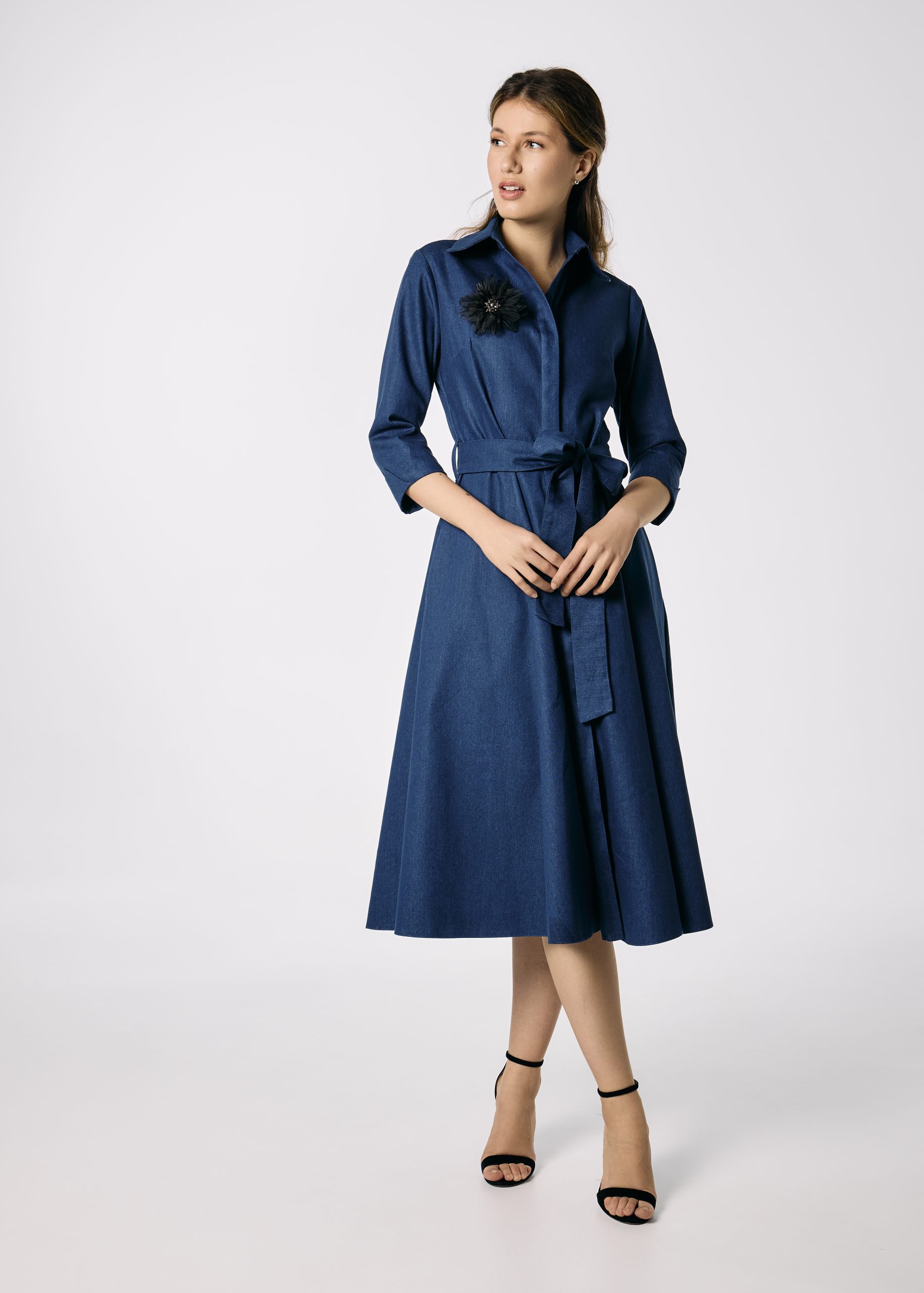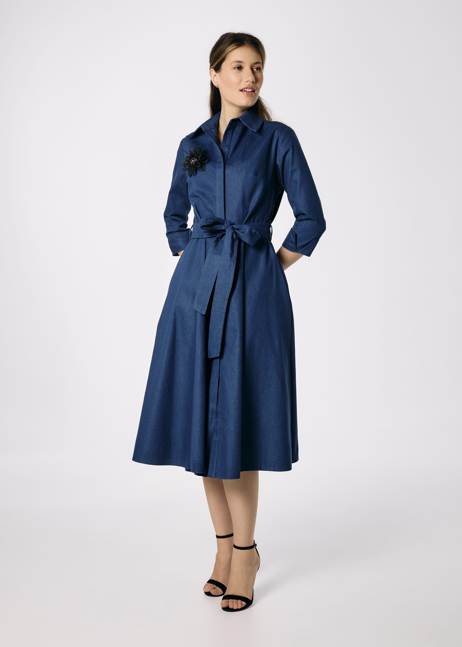 Rochie cămașă din denim în clini cu cordon și floare decorativă – Feminitate cu atitudine casual