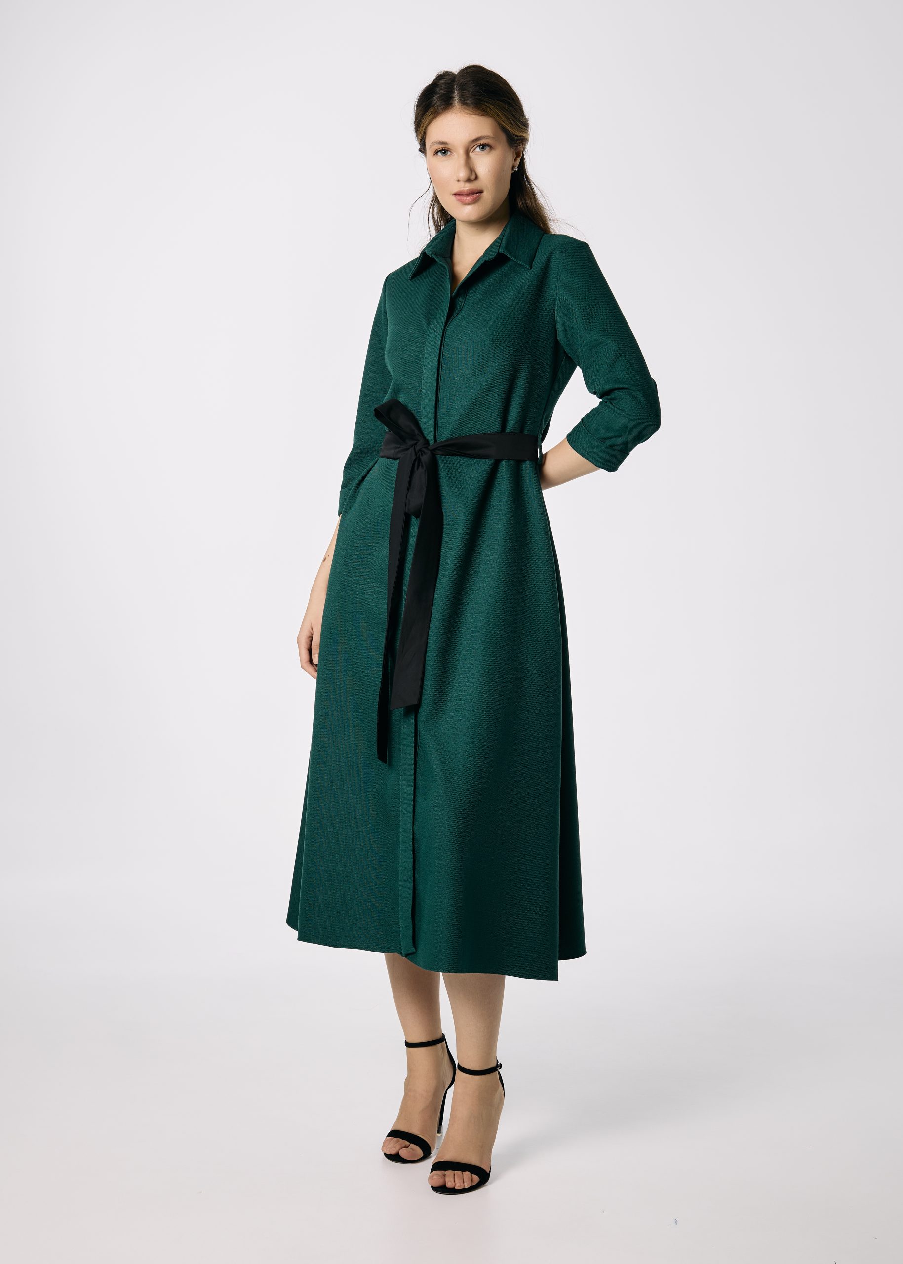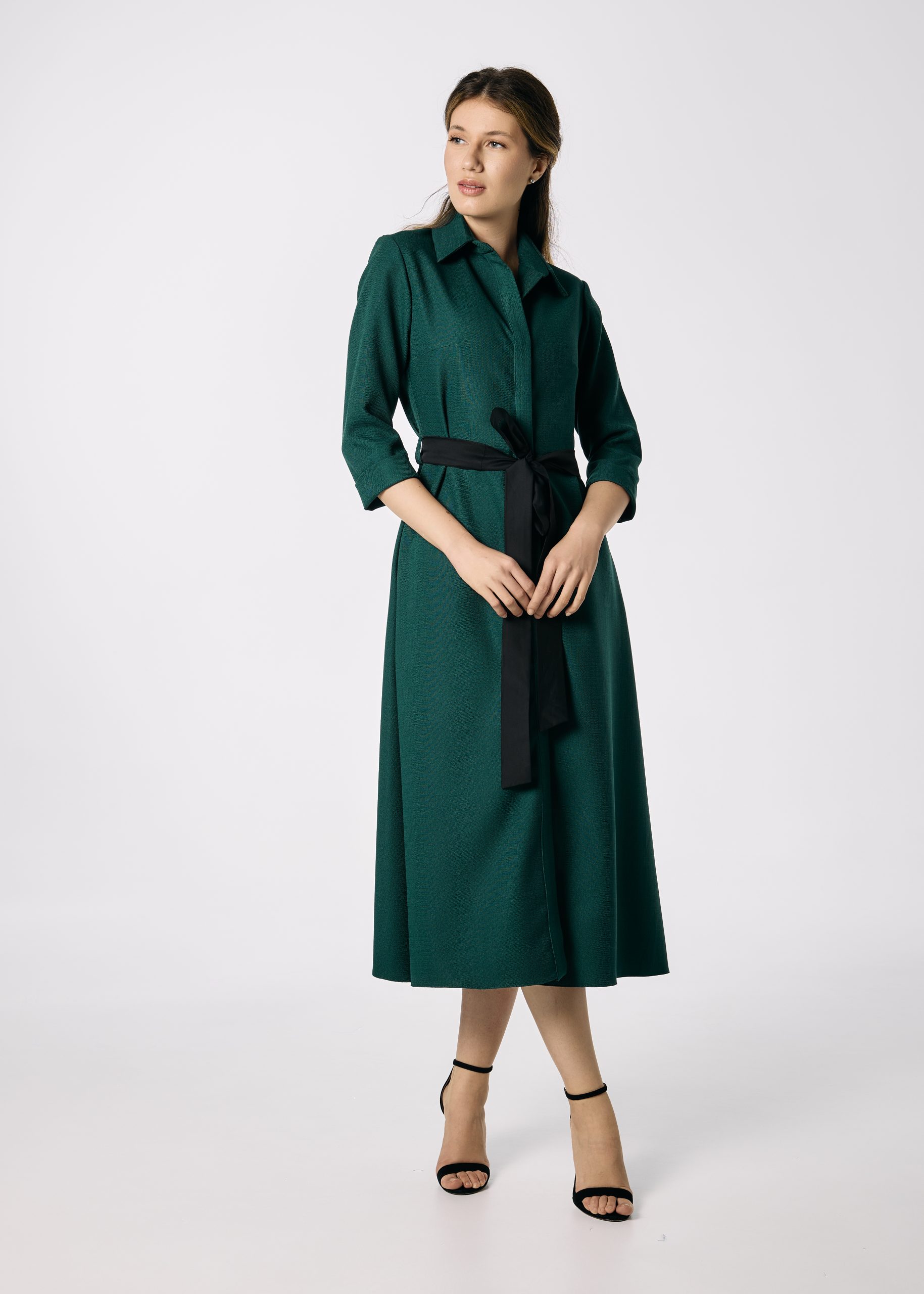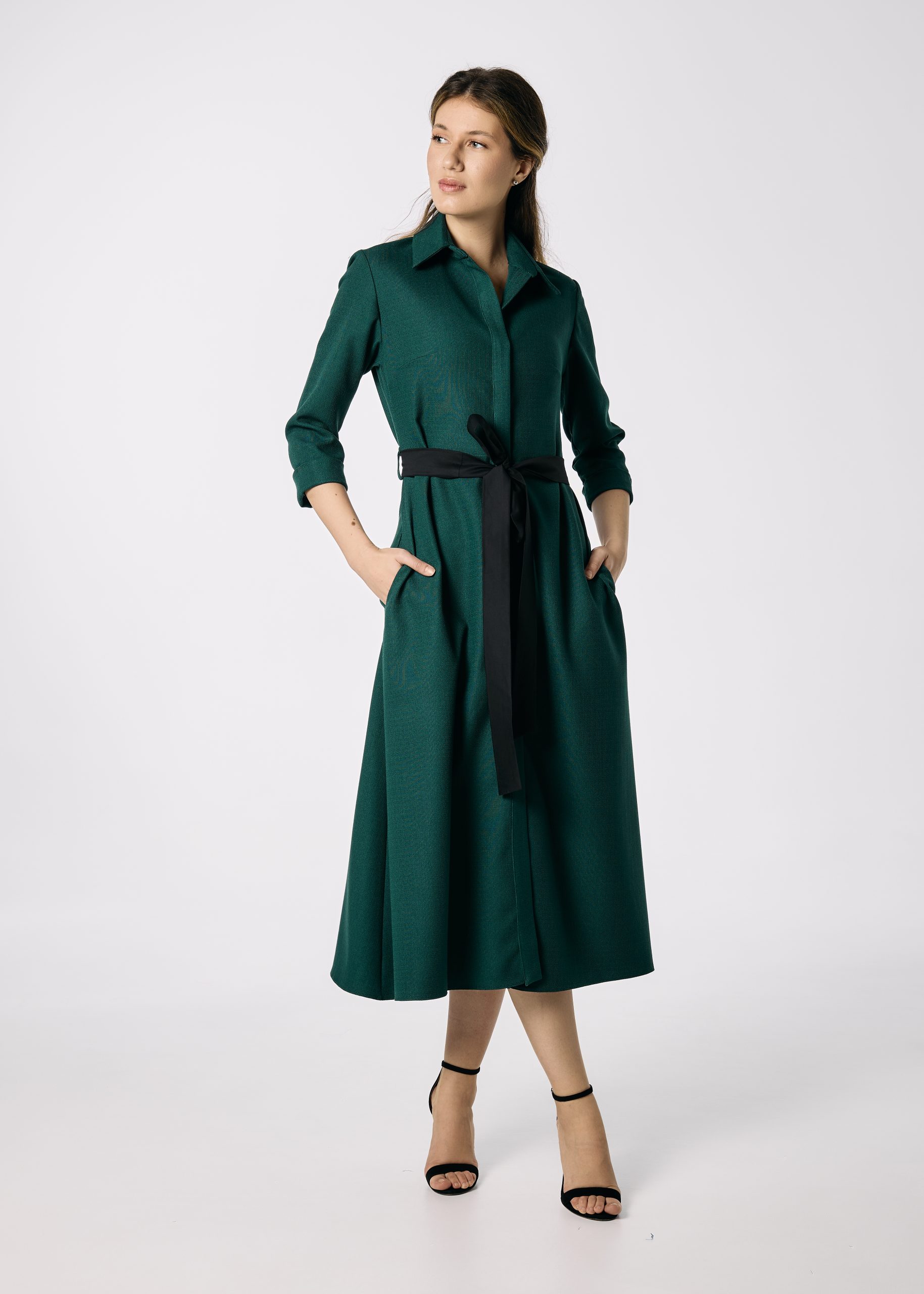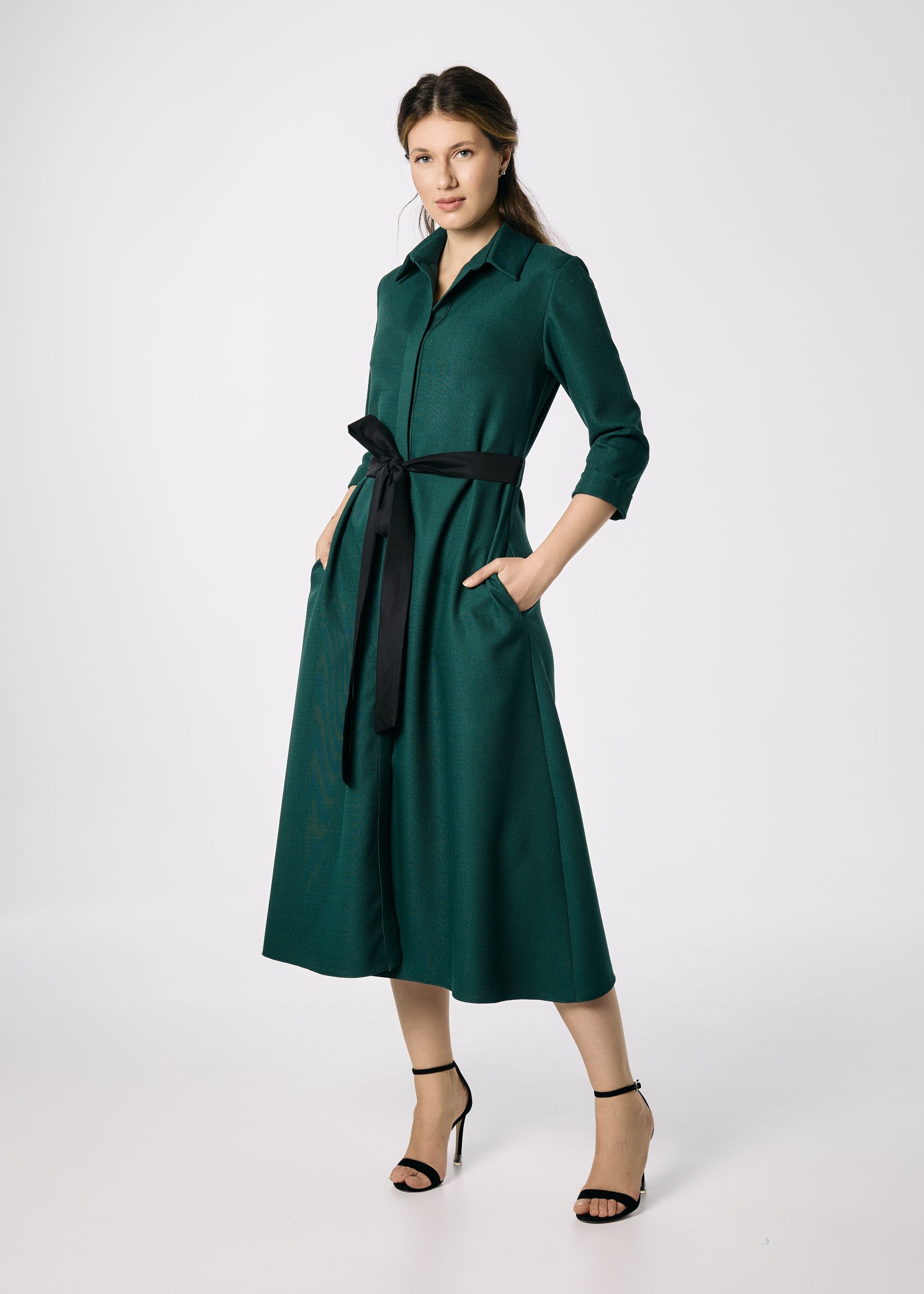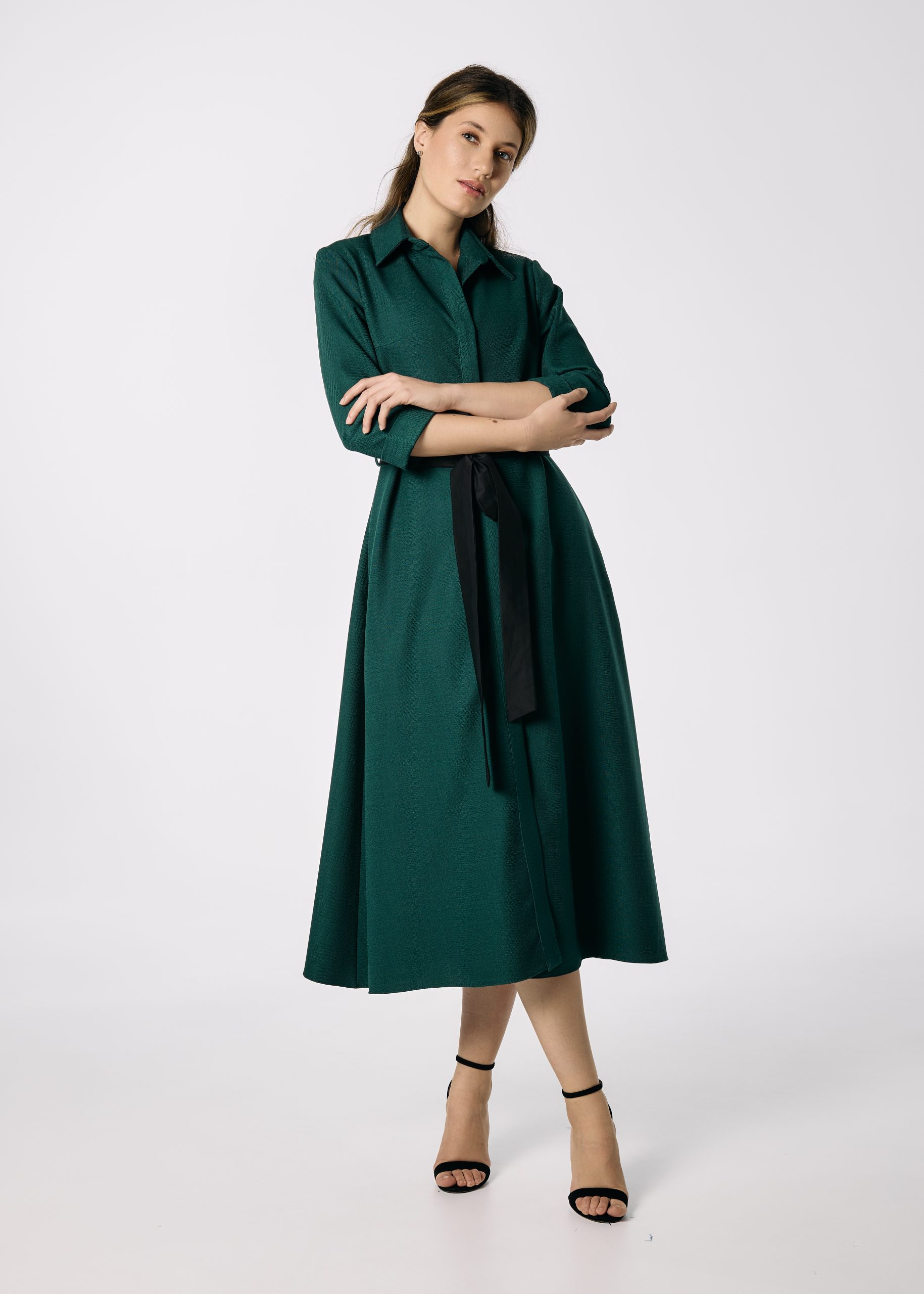 Poart-o cu pantofi cu toc sau botine pentru un look elegant de birou, ori cu cizme înalte pentru o apariție sofisticată de sezon. Accesoriile aurii sau negre completează perfect intensitatea nuanței de verde.