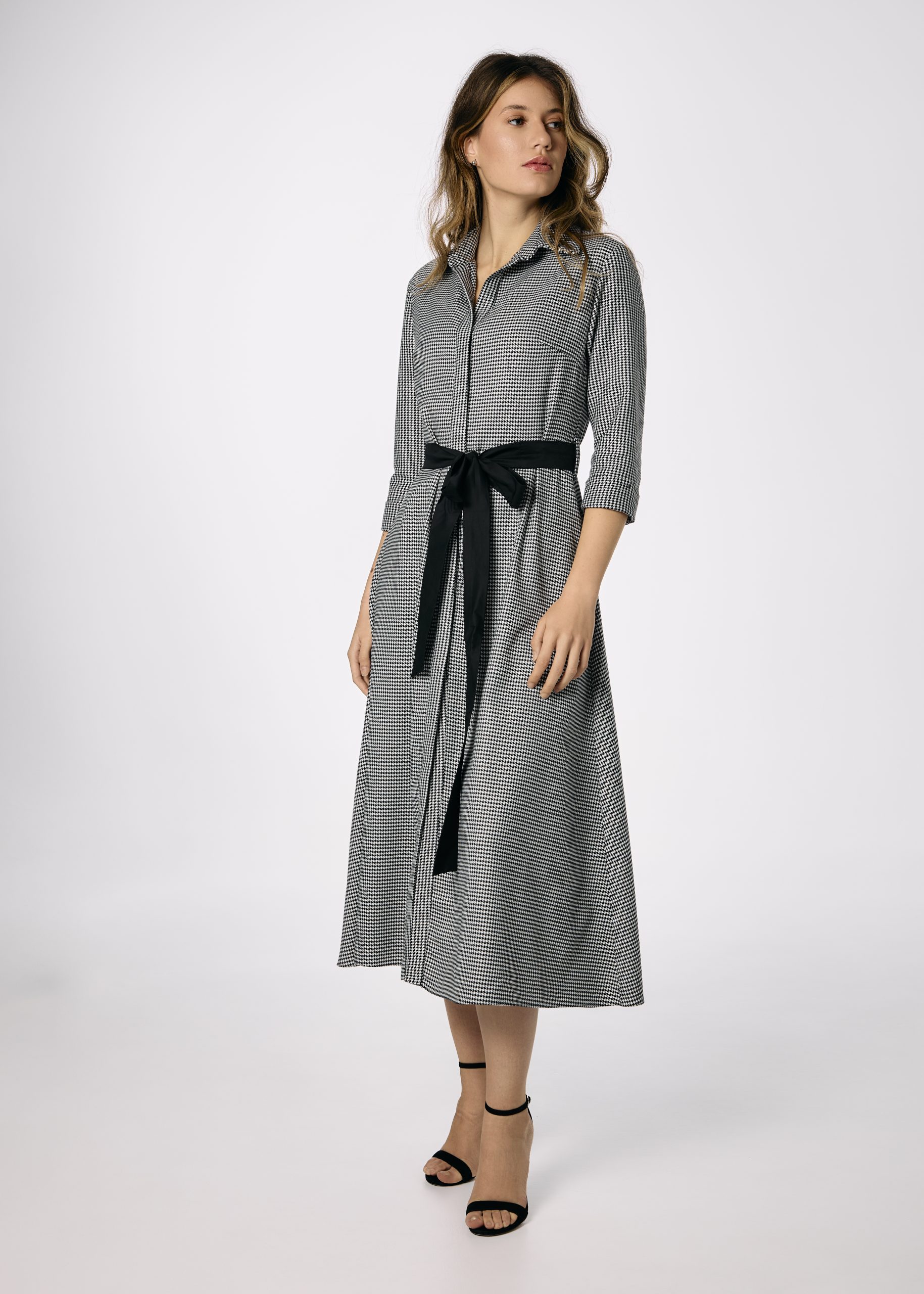 Rochie cămașă din stofă „picior de cocoș” cu fustă evazată și cordon în talie – Eleganță clasică reinterpretată