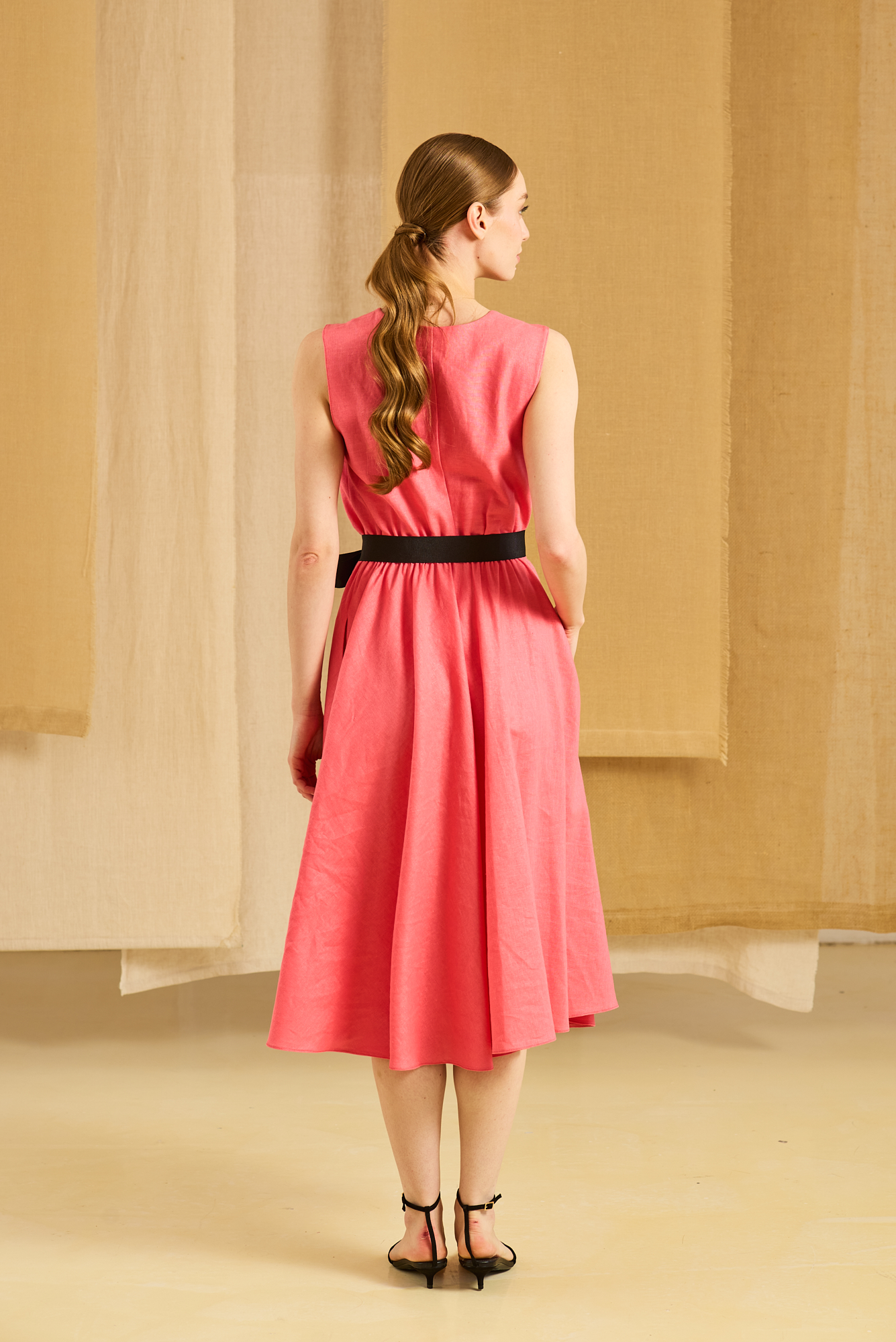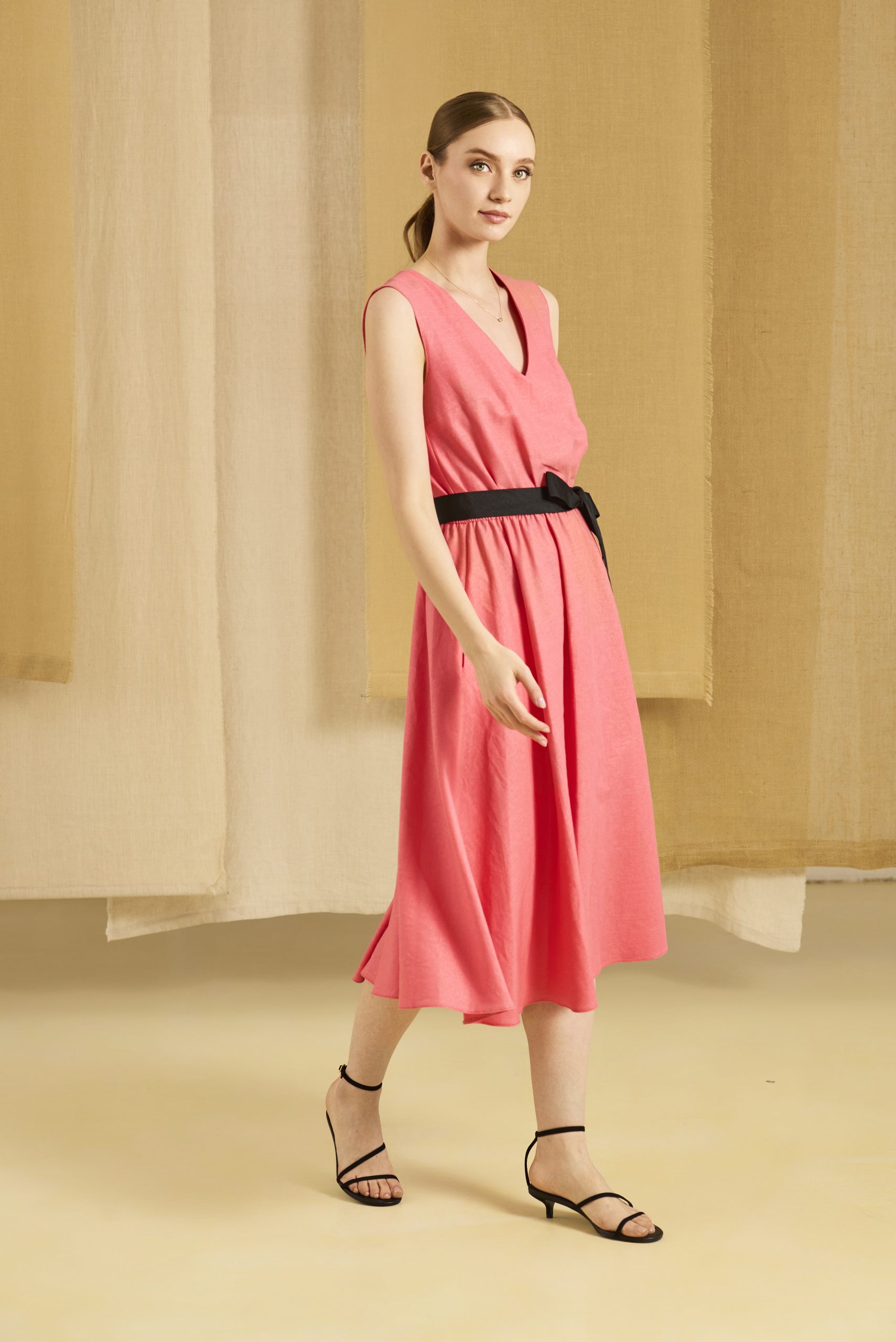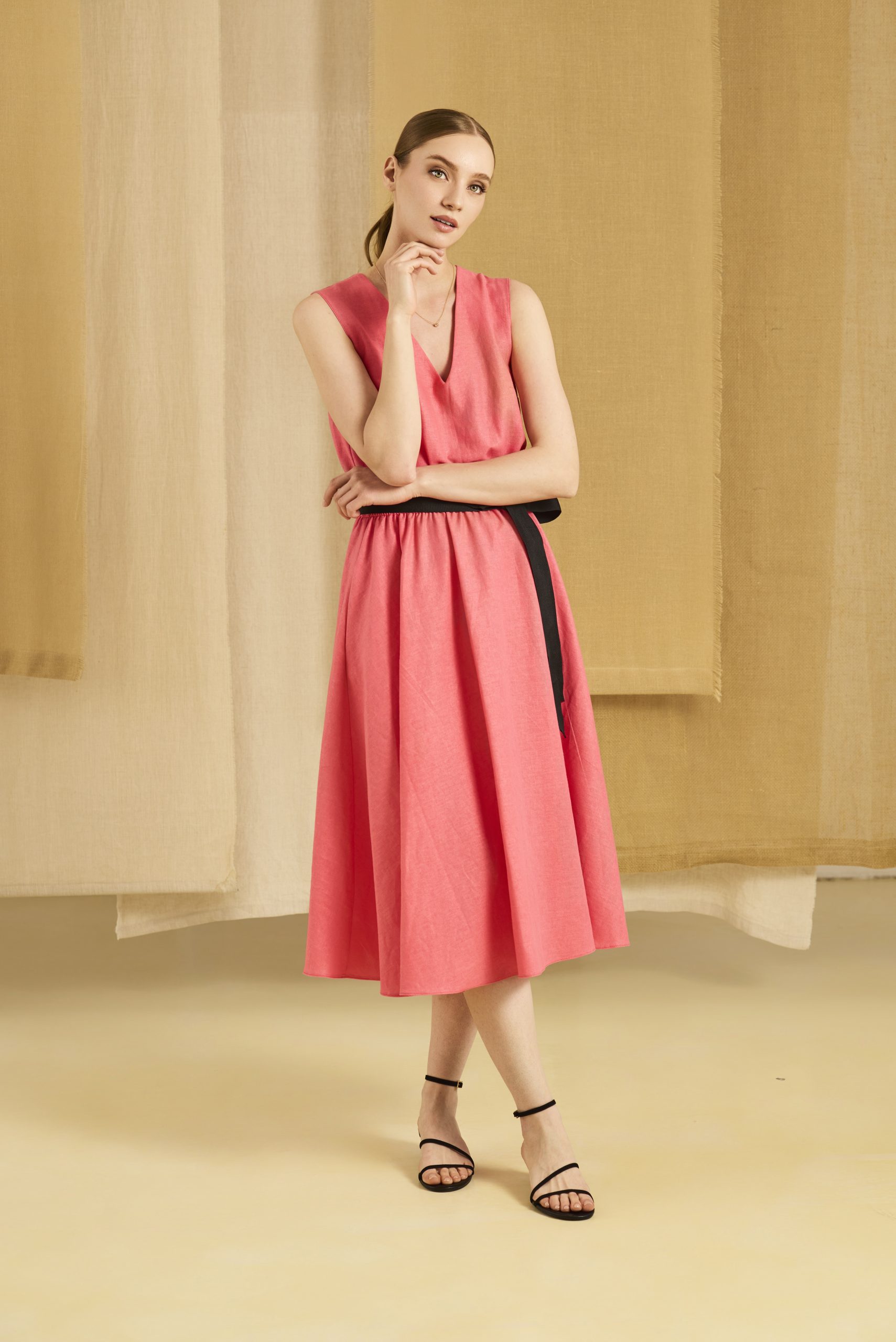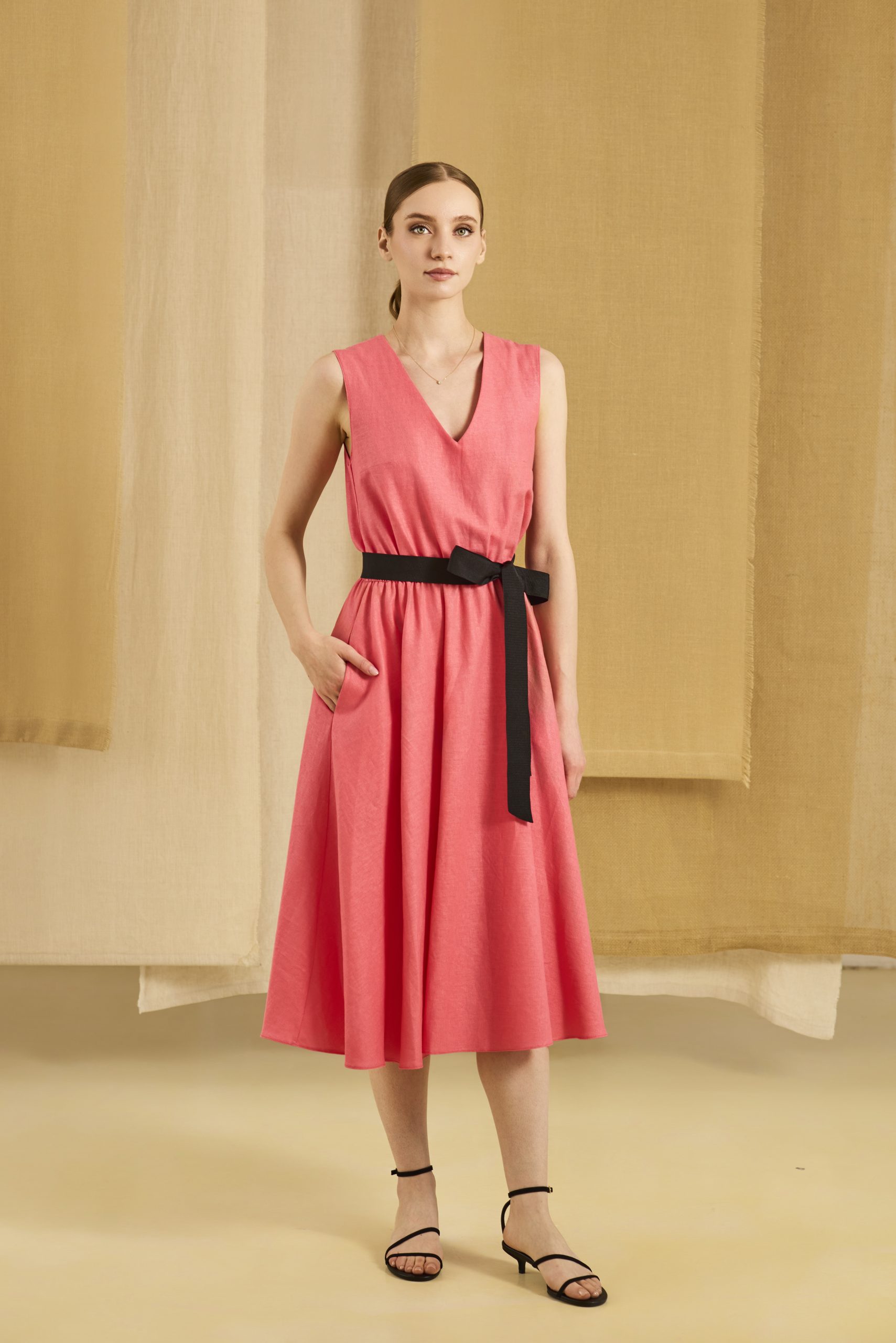 Realizată din in respirabil, rochia este ideală pentru zilele călduroase, oferind lejeritate și o senzație plăcută la purtare. Decolteul în V evidențiază delicat linia gâtului și adaugă un plus de feminitate, iar croiala fără mâneci pune în valoare silueta și conferă un aer fresh, estival.