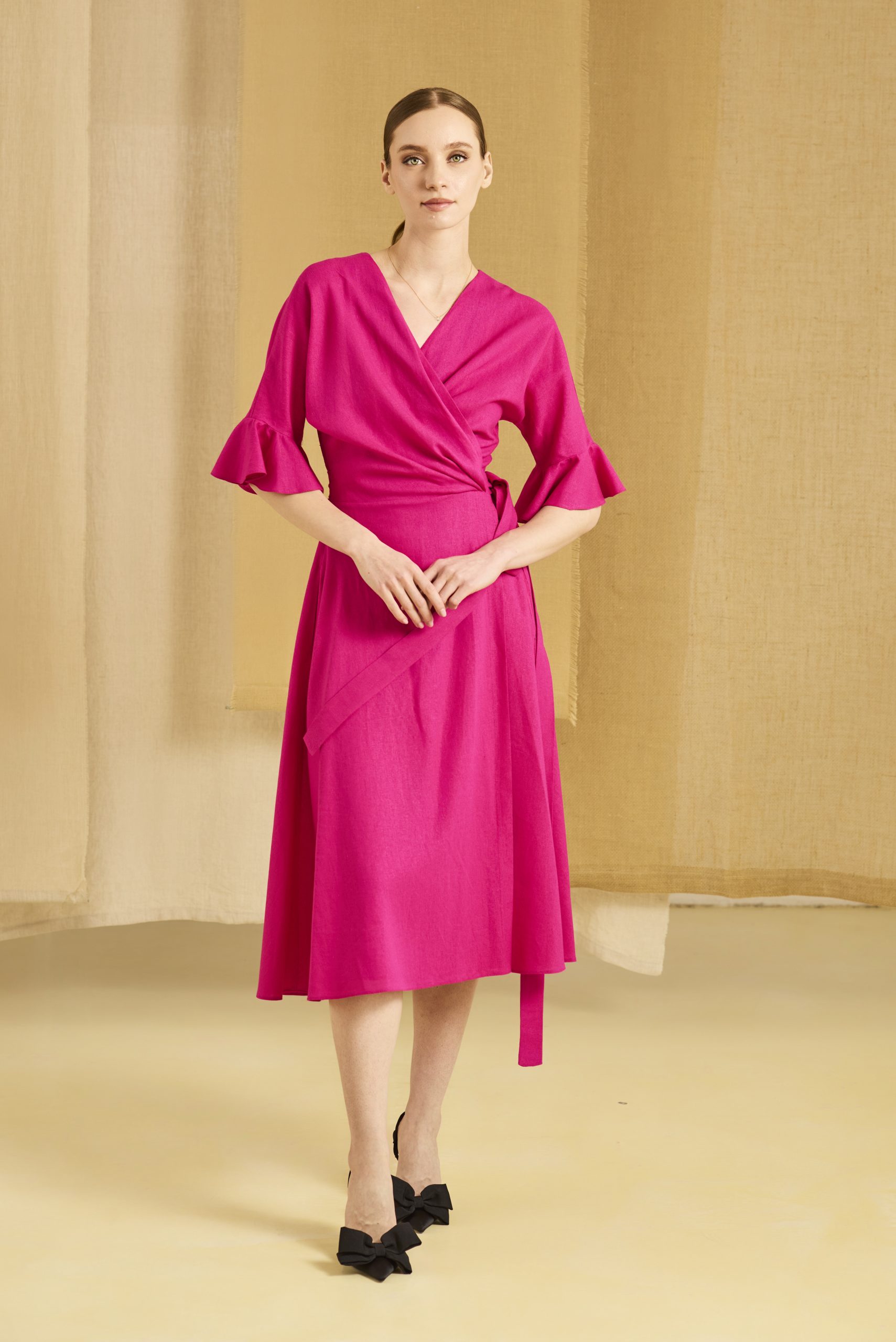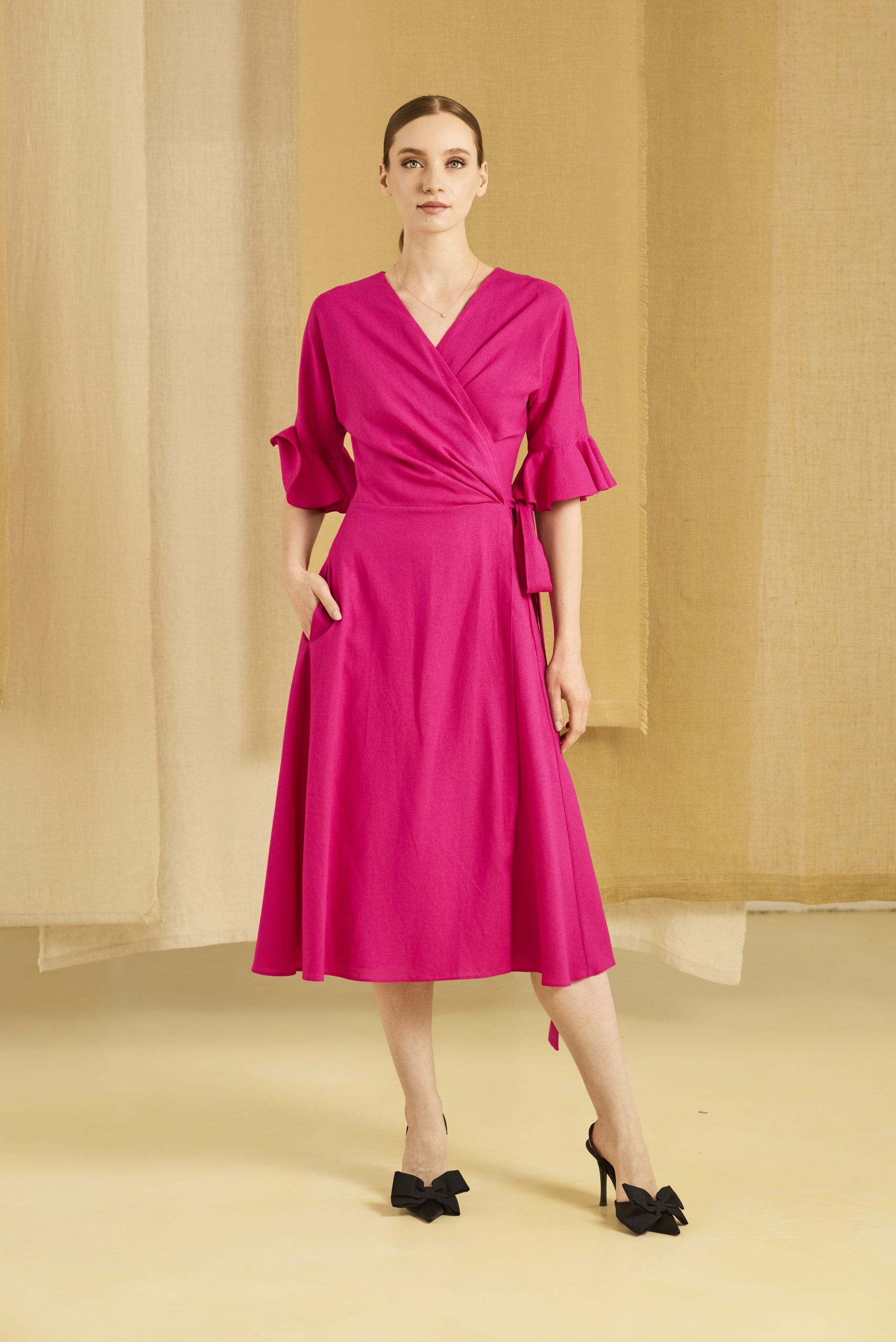 Fusta cloș oferă fluiditate și mișcare, creând un efect elegant și aerisit la fiecare pas. Realizată din in, rochia este respirabilă și confortabilă, ideală pentru zilele călduroase, fie că o porți la birou, la plimbare sau la un eveniment de zi.