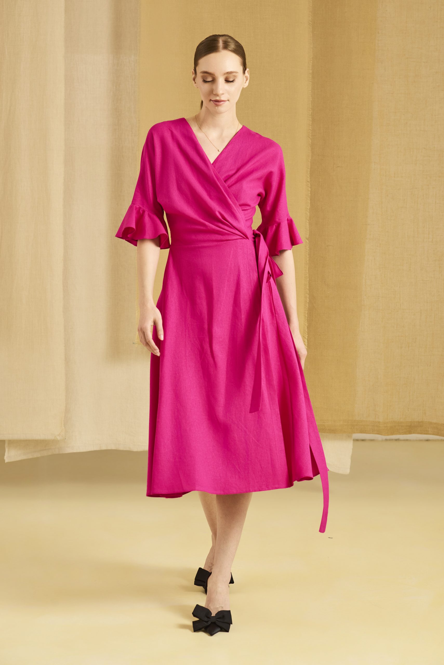 Lejeră, feminină și natural elegantă, rochia de zi petrecută din in este alegerea perfectă pentru sezonul cald. Croiala petrecută evidențiază delicat decolteul, iar fronseurile din zona bustului adaugă un plus de rafinament și subliniază armonios silueta.