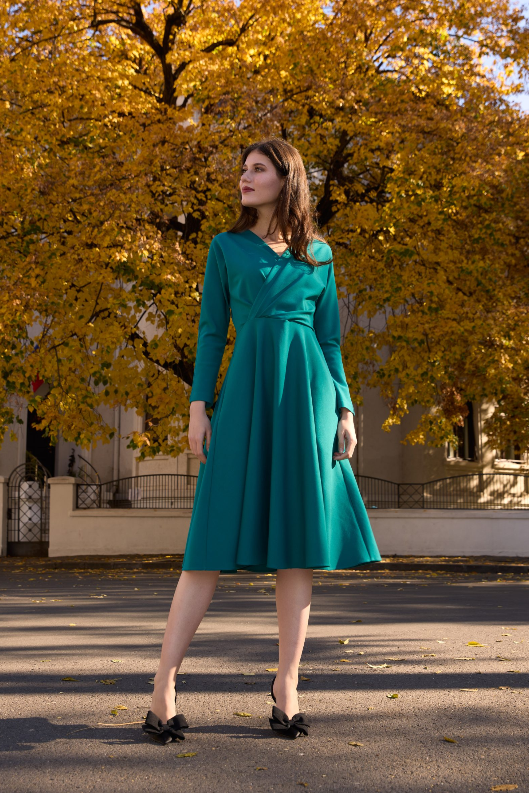 Fusta cloș, amplă și fluidă, creează mișcare și lejeritate la fiecare pas, iar lungimea midi o face potrivită atât pentru evenimente de zi, cât și pentru ocazii speciale. Mânecile trei sferturi adaugă echilibru designului și un plus de rafinament.